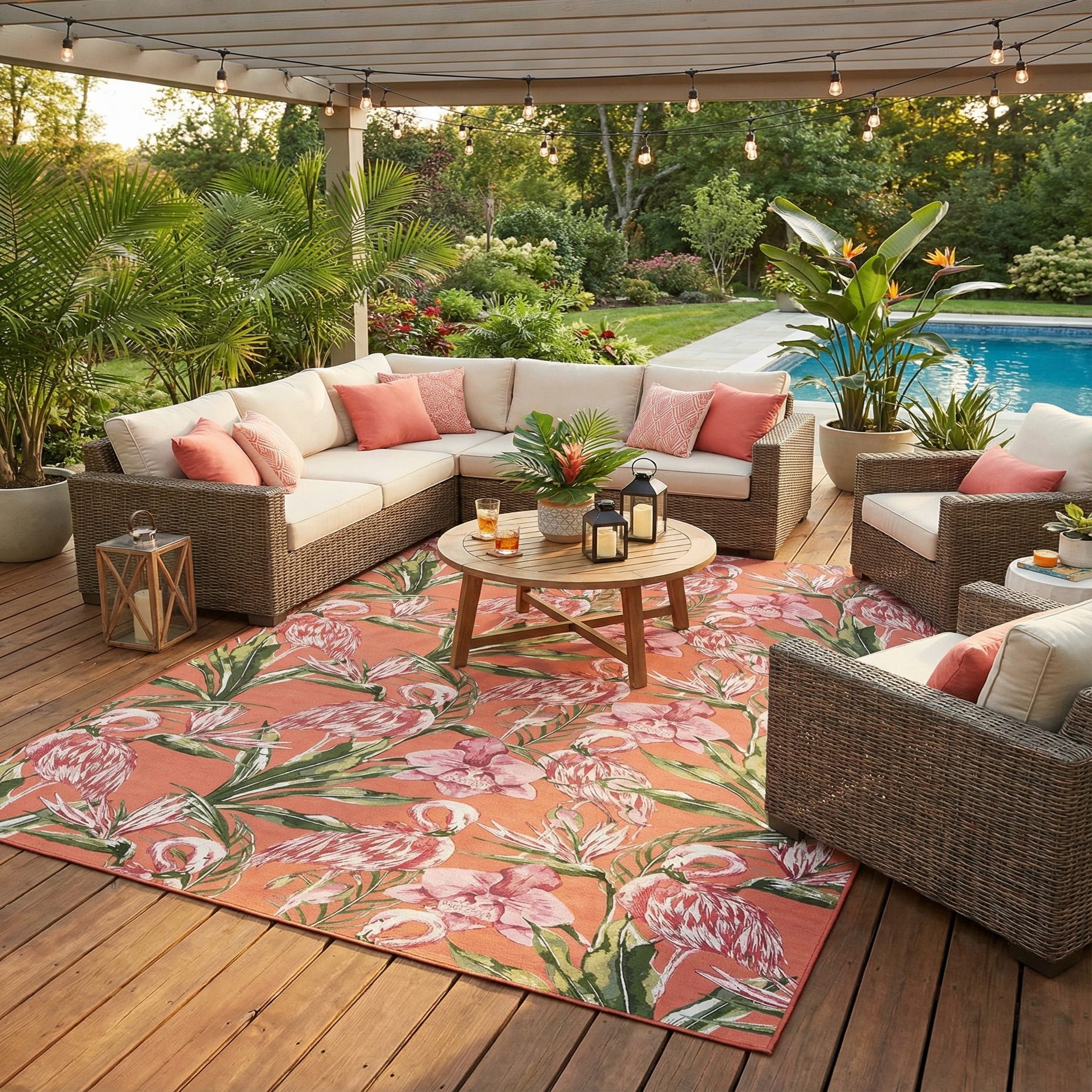 Machine-made of 75% polypropylene and 25% polyester, the rug has a low-profile, tightly woven face that is smooth to the touch with a soft, slightly brushed hand. Its surface lays flat and looks intentional under furniture, making it a practical choice for a covered patio, sunroom, or poolside seating area. It also works well inside in coastal, tropical, or eclectic living and dining spaces—pair with rattan or light-wood furnishings, neutral linens, and potted greenery to let the coral and pink accents pop.