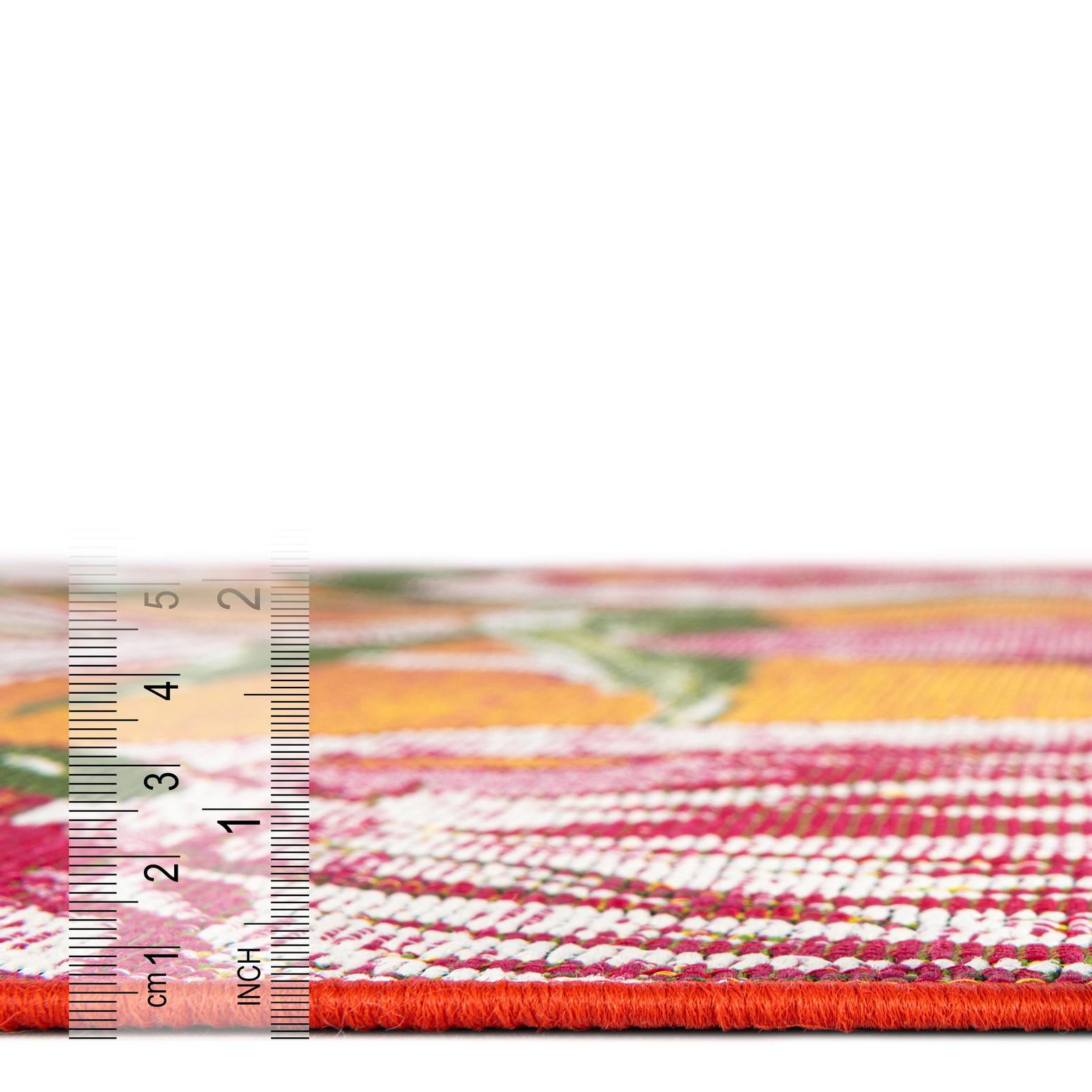 This rug works well wherever a splash of color and pattern is needed: place it beneath a small bistro set on a covered porch, anchor a sunroom seating group with rattan chairs and linen cushions, or use it to add warmth to a screened patio alongside terracotta planters. It also pairs easily with neutral wood tones or mid-century furnishings for a fresh, tropical-inflected interior, and complements accent pillows or throws in ivory, green, or muted pink to tie the look together.