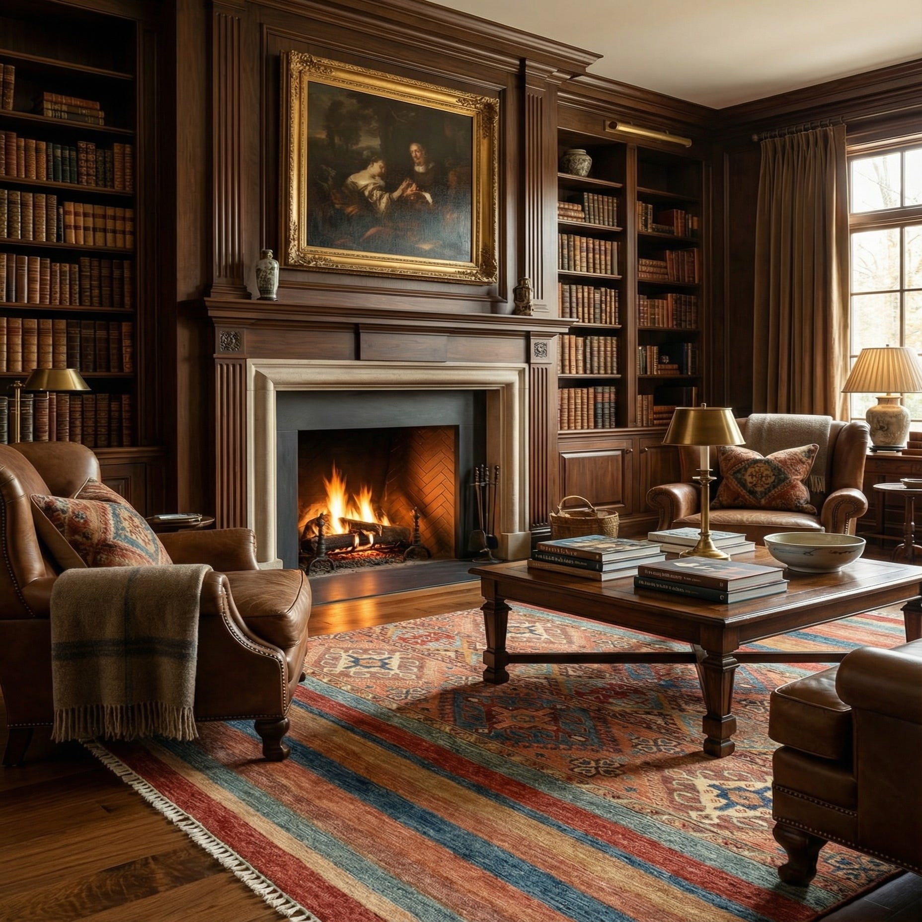 This rug's rich color palette and timeless design make it versatile for a range of decor settings. It could serve as a statement piece in a minimalist setting to inject color and pattern or blend well with eclectic or traditional interiors, complementing wood finishes and rich textiles. The natural fibers and handcrafted nature of the rug suggest placement in a space valued for comfort and authenticity, such as a living area or a cozy study.