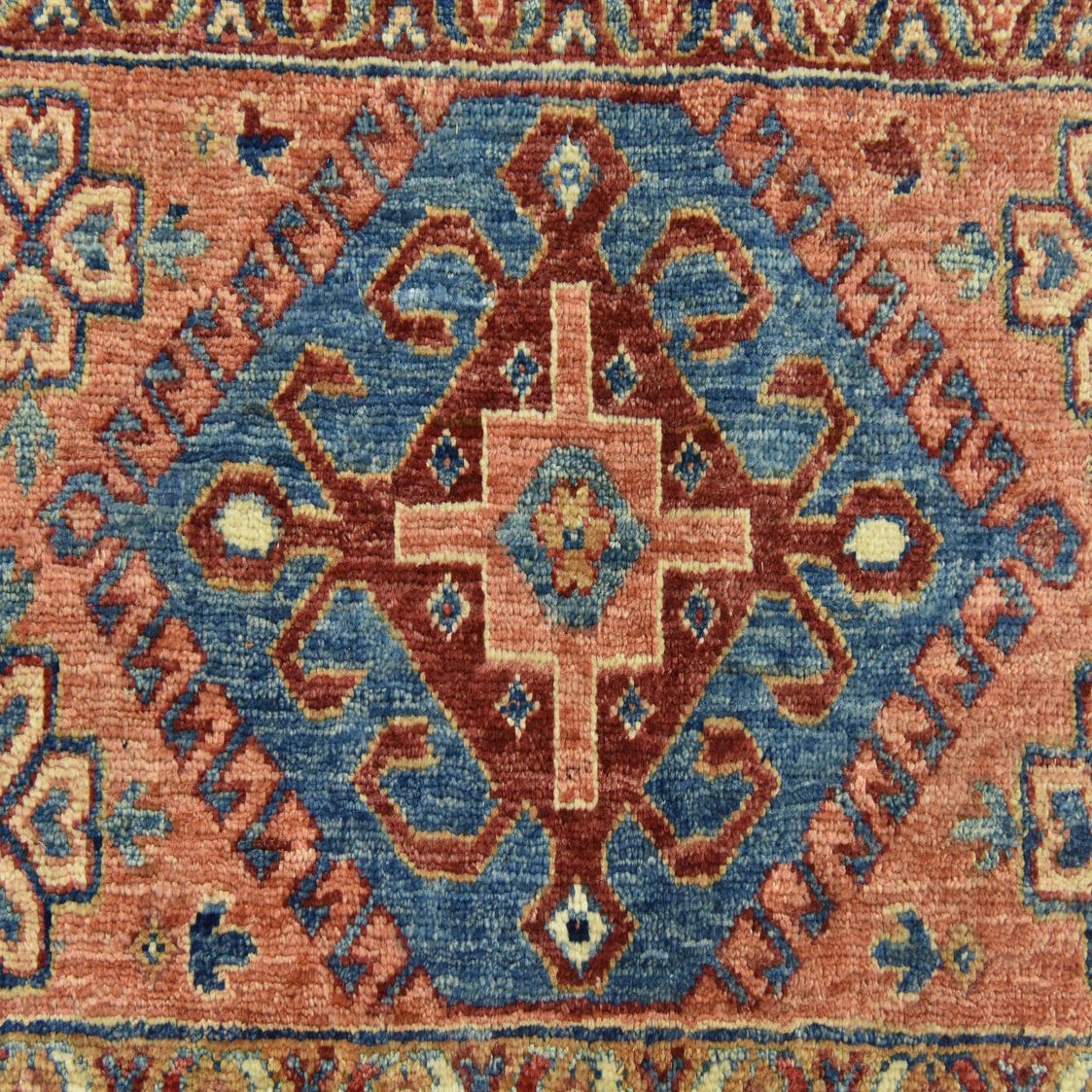 Primary color is Coral. Colors in this rug include: Coral, Blue, Burgundy, Cream, Navy Blue, Orange, Peach, Tan.
