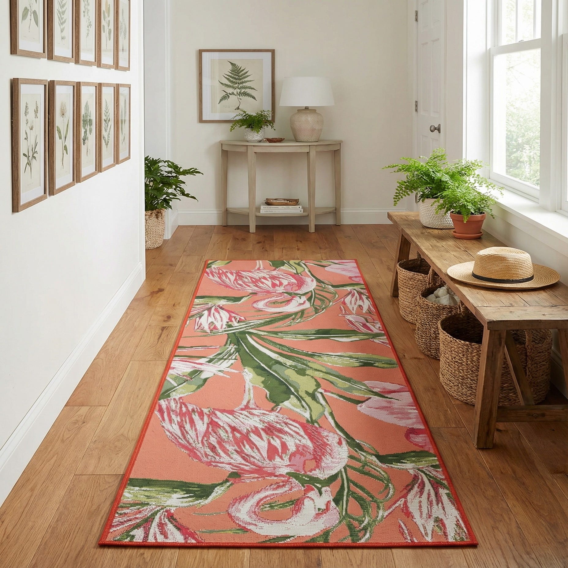 A 6 ft runner rug featuring a modern floral pattern with pink flamingos and green tropical leaves on an orange background, suitable for a hallway or patio.