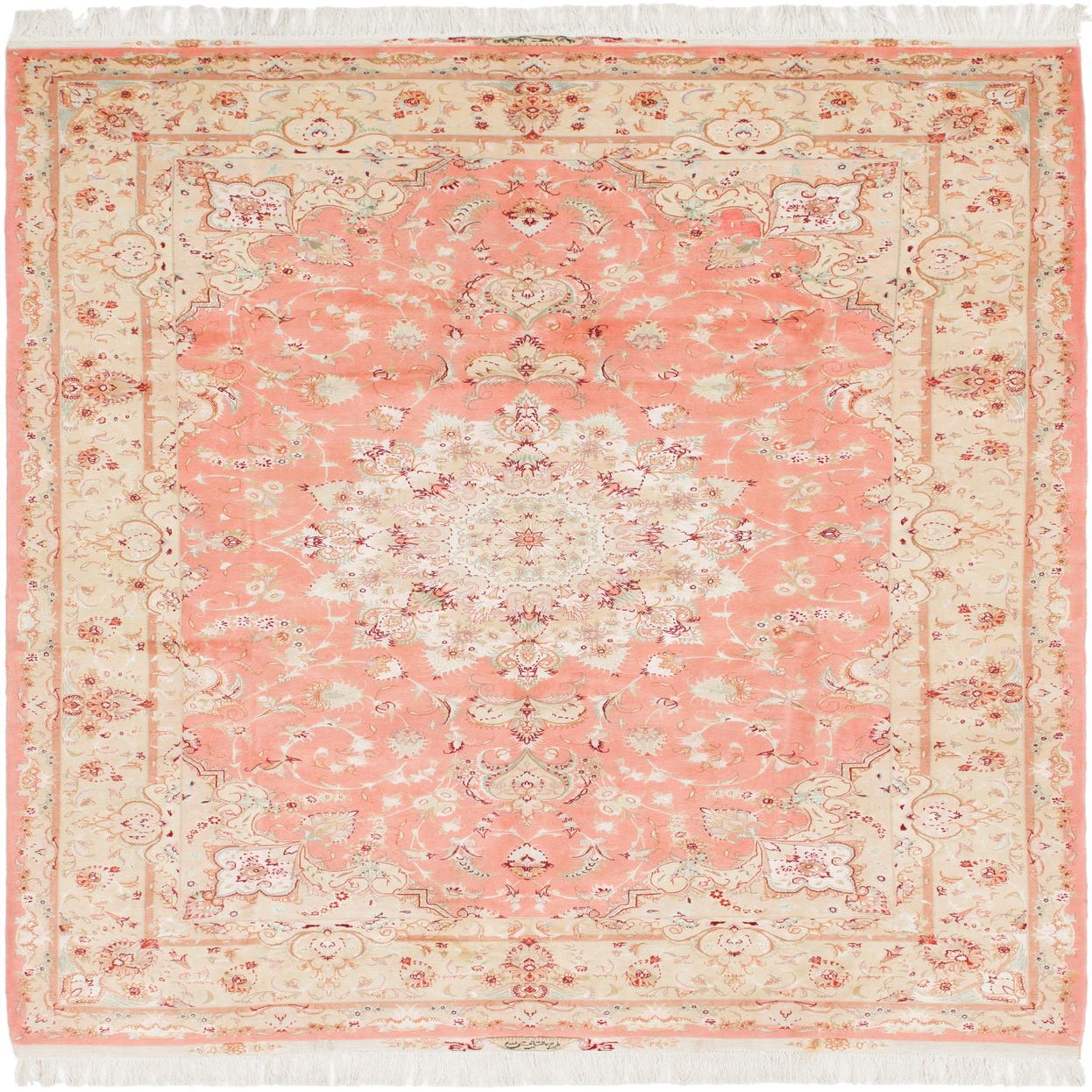 A 7x10 rectangular handmade Persian rug featuring a central medallion and botanical patterns in oranges, pinks, and creams.