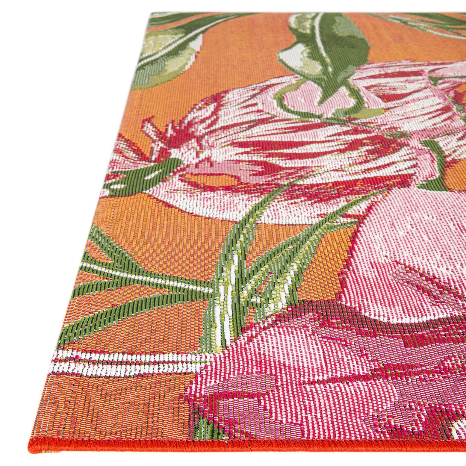 A vibrant orange square rug featuring a modern floral pattern with pink flamingos, orchids, and green tropical leaves, perfect for an outdoor patio.