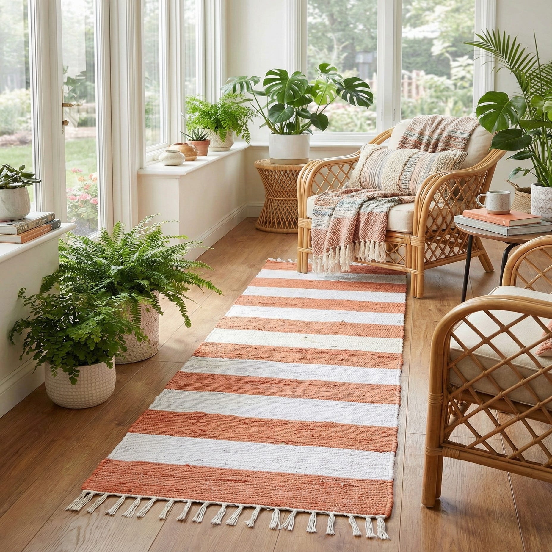 This runner works well in a hallway or entry, along a kitchen aisle, or beside a bed to add a warm pop of color without overwhelming a room. Pair it with light wood floors, white or neutral cabinetry, woven baskets, and linen textiles for a relaxed, lived-in feel, or use it to introduce a lively coral accent in a contemporary or minimalist space.