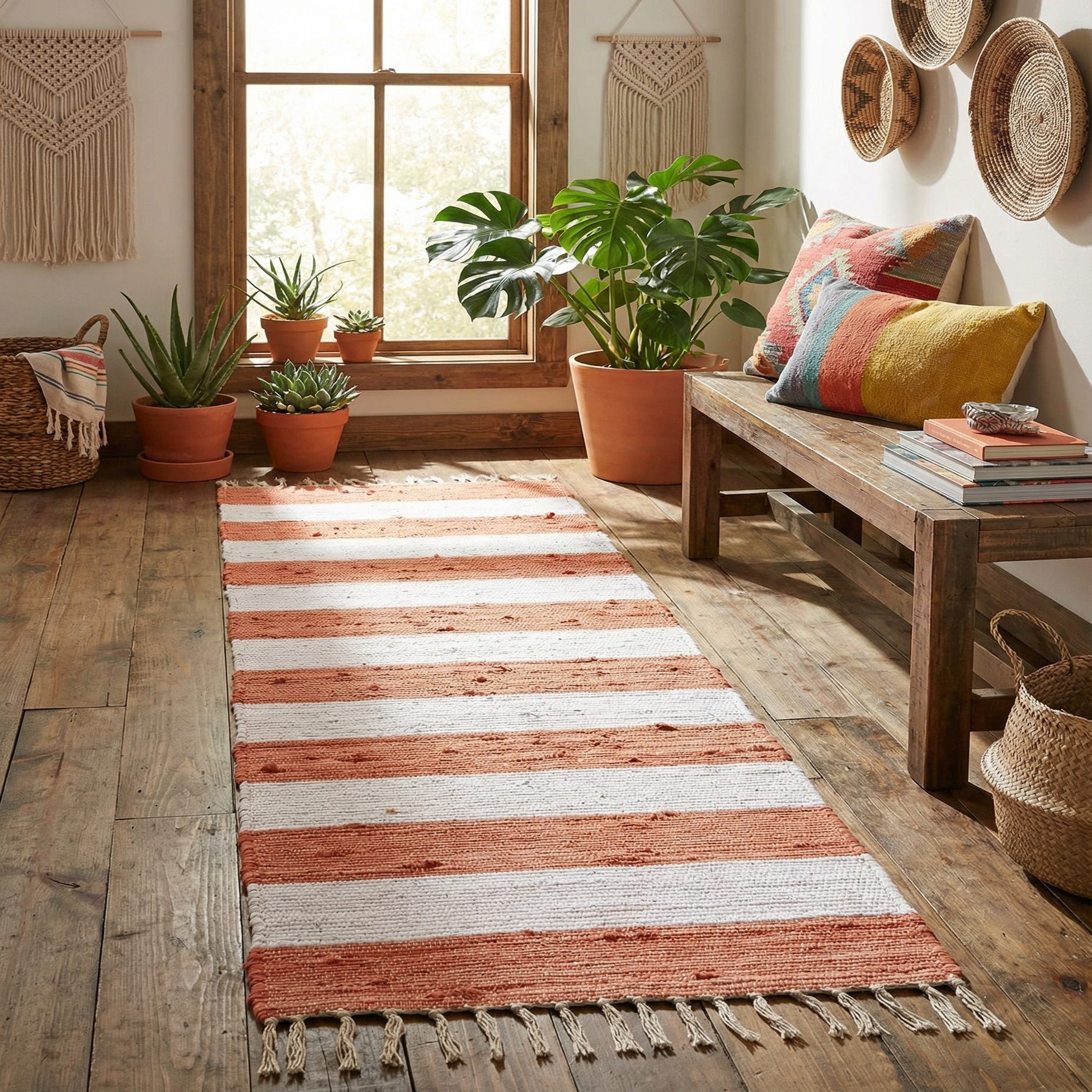 This runner works well in narrow circulation spaces like hallways and entryways or placed alongside a kitchen island or sink to add warmth underfoot. It pairs naturally with light wood floors, rattan or wicker furnishings and linen upholstery for a relaxed coastal or cottage look, and it also complements modern farmhouse and laid-back bohemian interiors when layered with neutral rugs or mixed-pattern textiles. Use it to introduce a pop of coral into a neutral palette or to echo warmer accent tones in your existing decor.