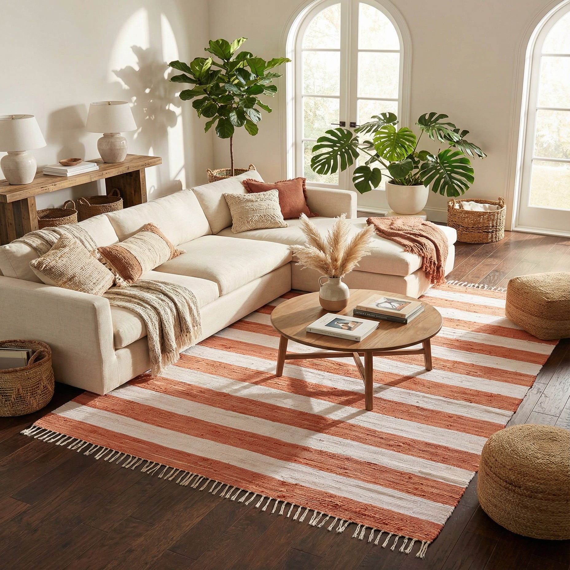 The warm coral stripe brings a fresh, sunlit energy that pairs nicely with natural woods, rattan, and linen upholstery for a coastal or cottage-style scheme. It also works as a casual anchor in modern farmhouse, bohemian, or transitional interiors—place it under a coffee table in the living room, beneath a dining table, at the foot of a bed, or in a bright entry or sunroom to add color and pattern without overwhelming the space.