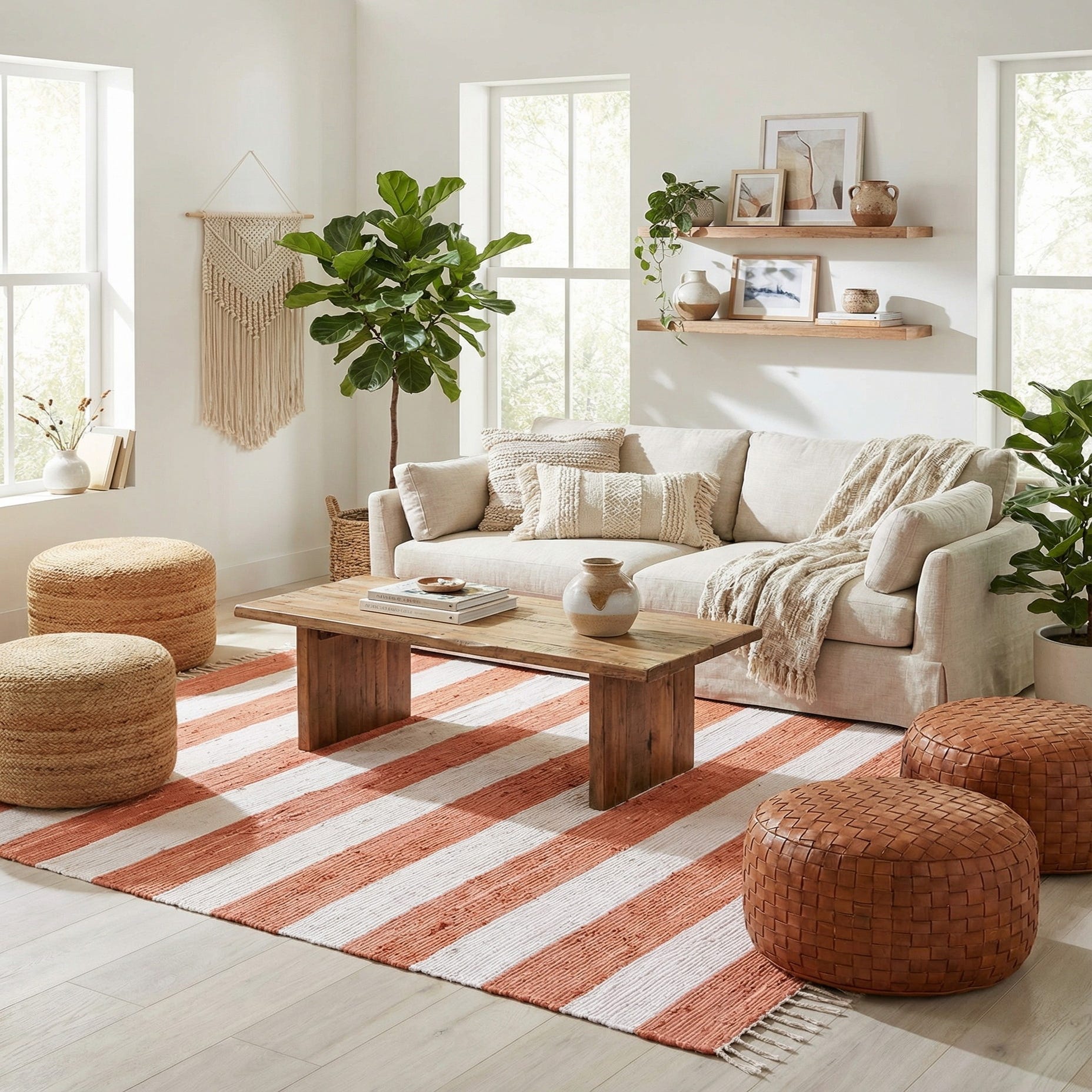 The warm coral stripe brings a fresh, sunlit energy that pairs nicely with natural woods, rattan, and linen upholstery for a coastal or cottage-style scheme. It also works as a casual anchor in modern farmhouse, bohemian, or transitional interiors—place it under a coffee table in the living room, beneath a dining table, at the foot of a bed, or in a bright entry or sunroom to add color and pattern without overwhelming the space.