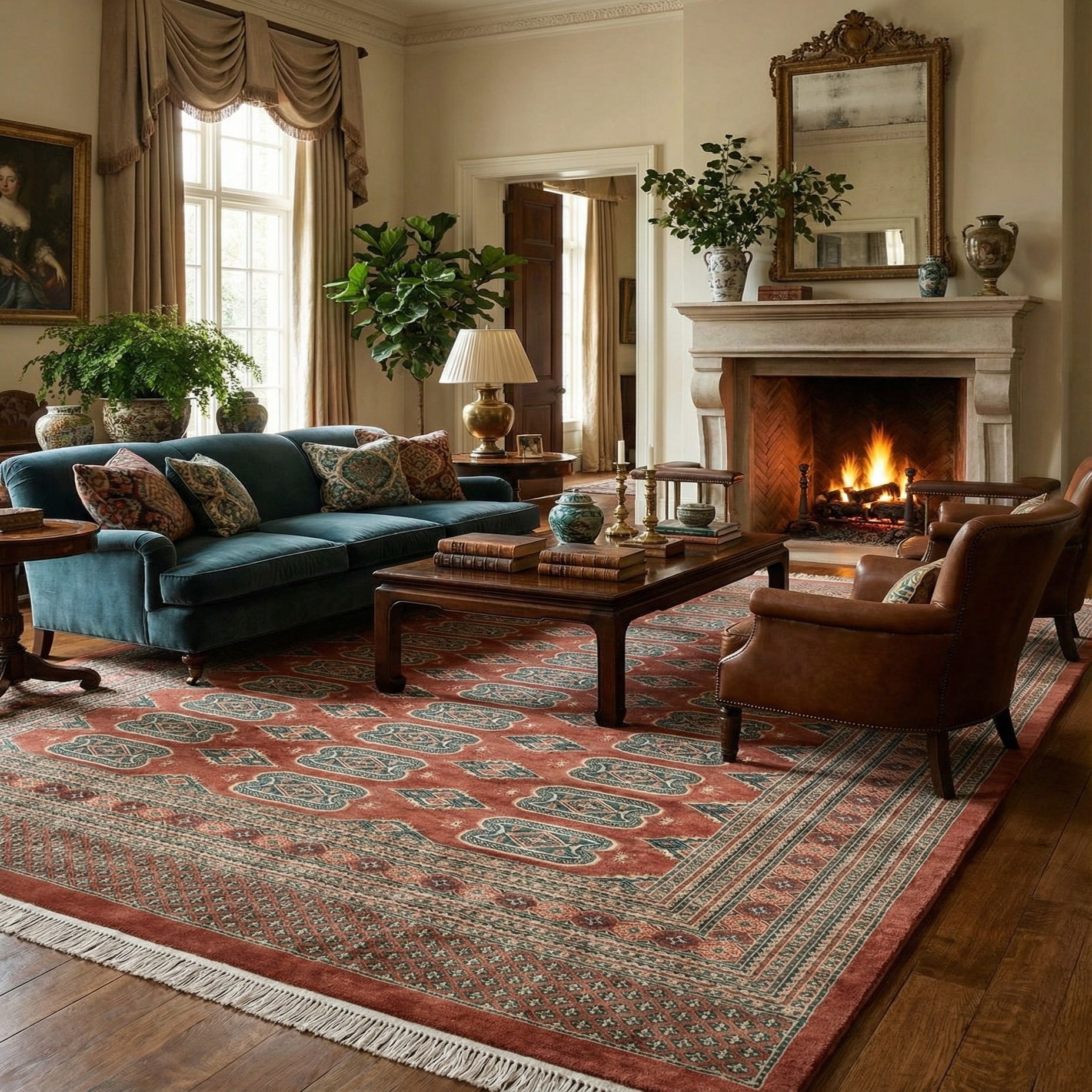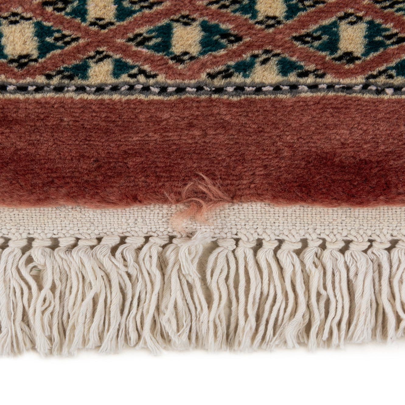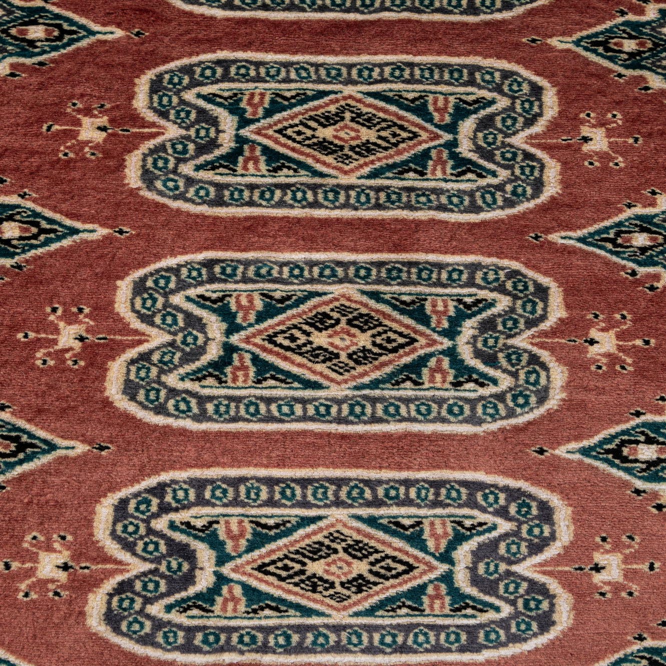 A 7x10 rectangular coral pink Bokhara rug featuring intricate tribal and traditional patterns in teal, beige, and brown, with fringe.