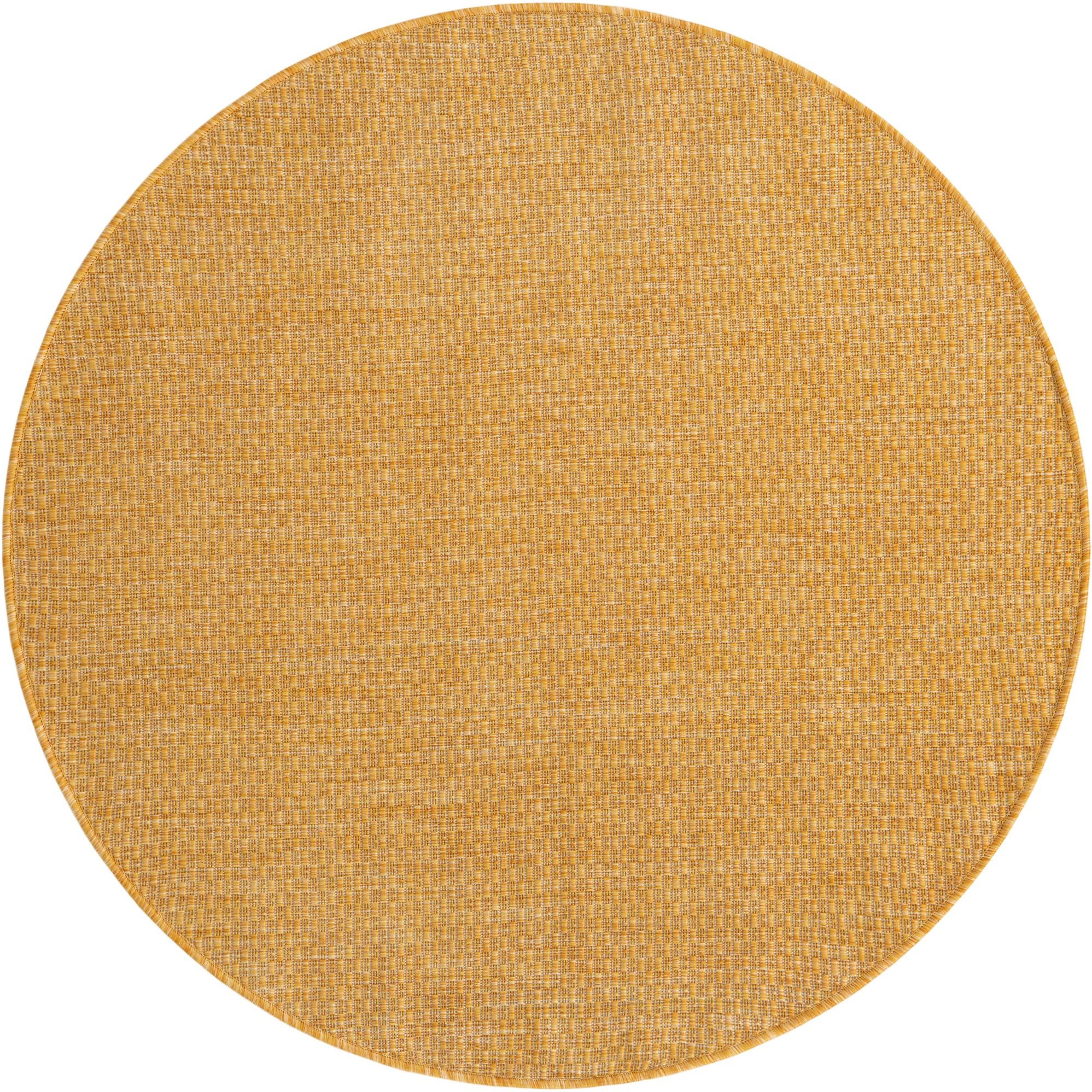 A 4' round yellow indoor/outdoor rug with a flat, textured weave, perfect for a patio.