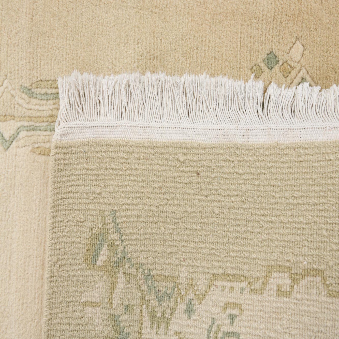 A 10 ft Darya runner rug in ivory with a modern Oriental border design in cream, sage green, and gold.