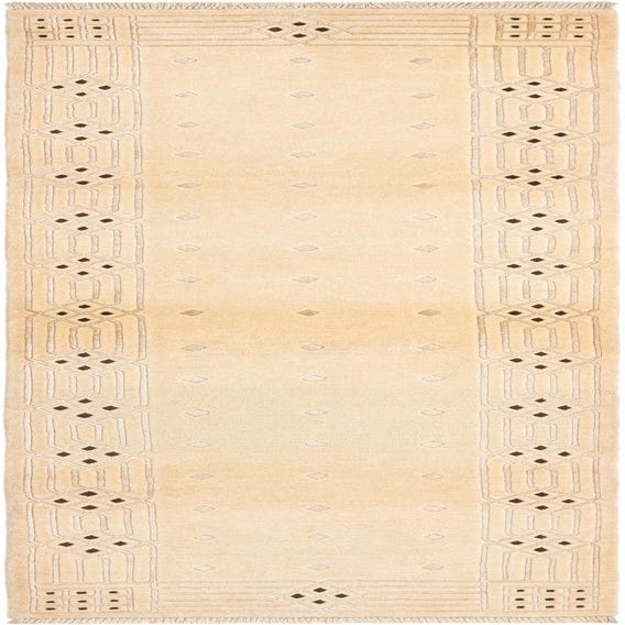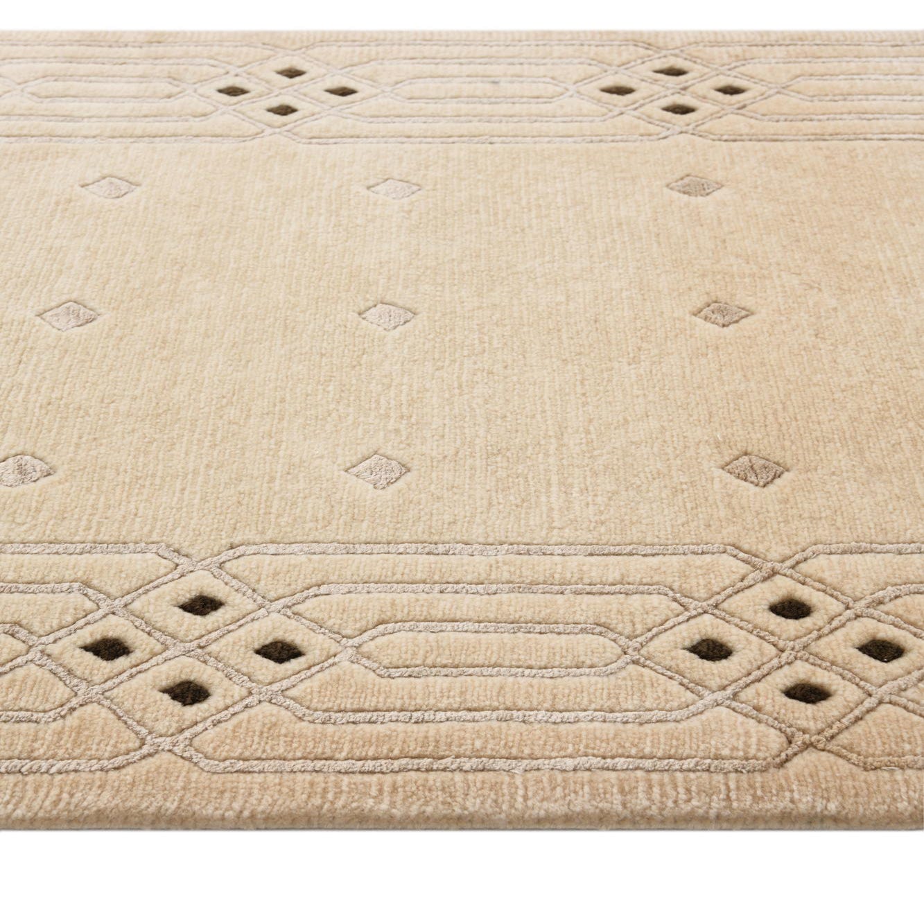 The Darya Collection presents a refined 10 Ft runner, meticulously hand-knotted from 100% wool for a durable and soft texture. This runner showcases a symmetrical pattern with bold, linear borders that frame a cream field. Brown and ivory accents punctuate the design, creating a sense of harmony and structure. The rug's overall aesthetic blends traditional and contemporary elements, making it a versatile addition to a variety of interior settings.