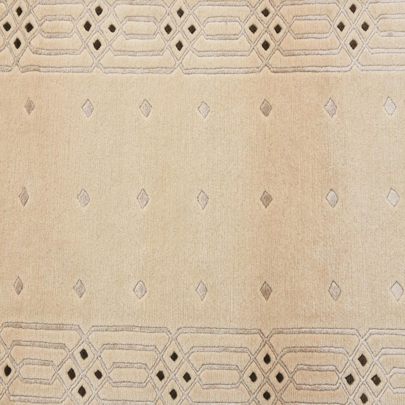 A 10 ft Darya runner rug in ivory wool with a modern oriental pattern, featuring dark geometric accents along the borders.