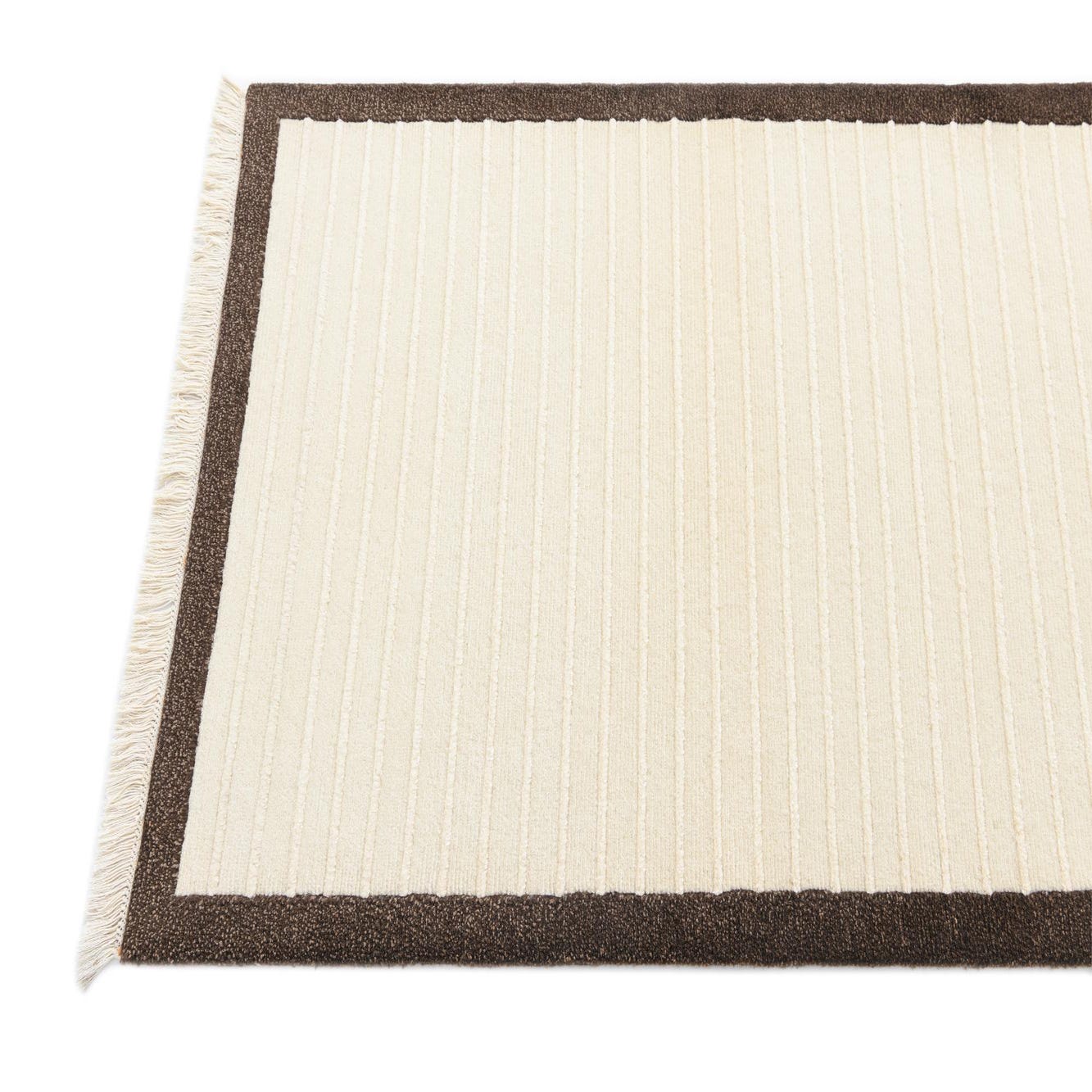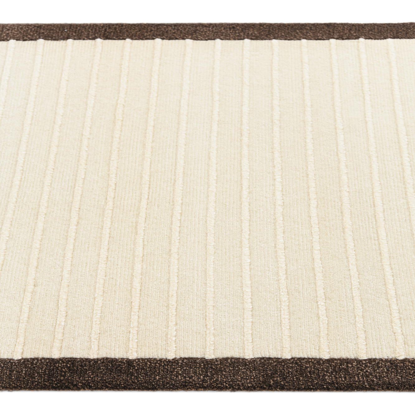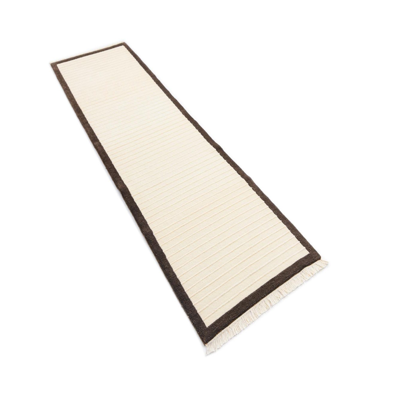 A 10 ft Darya runner rug in ivory with a dark brown border and fringe, featuring a subtle striped texture.