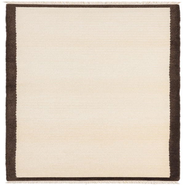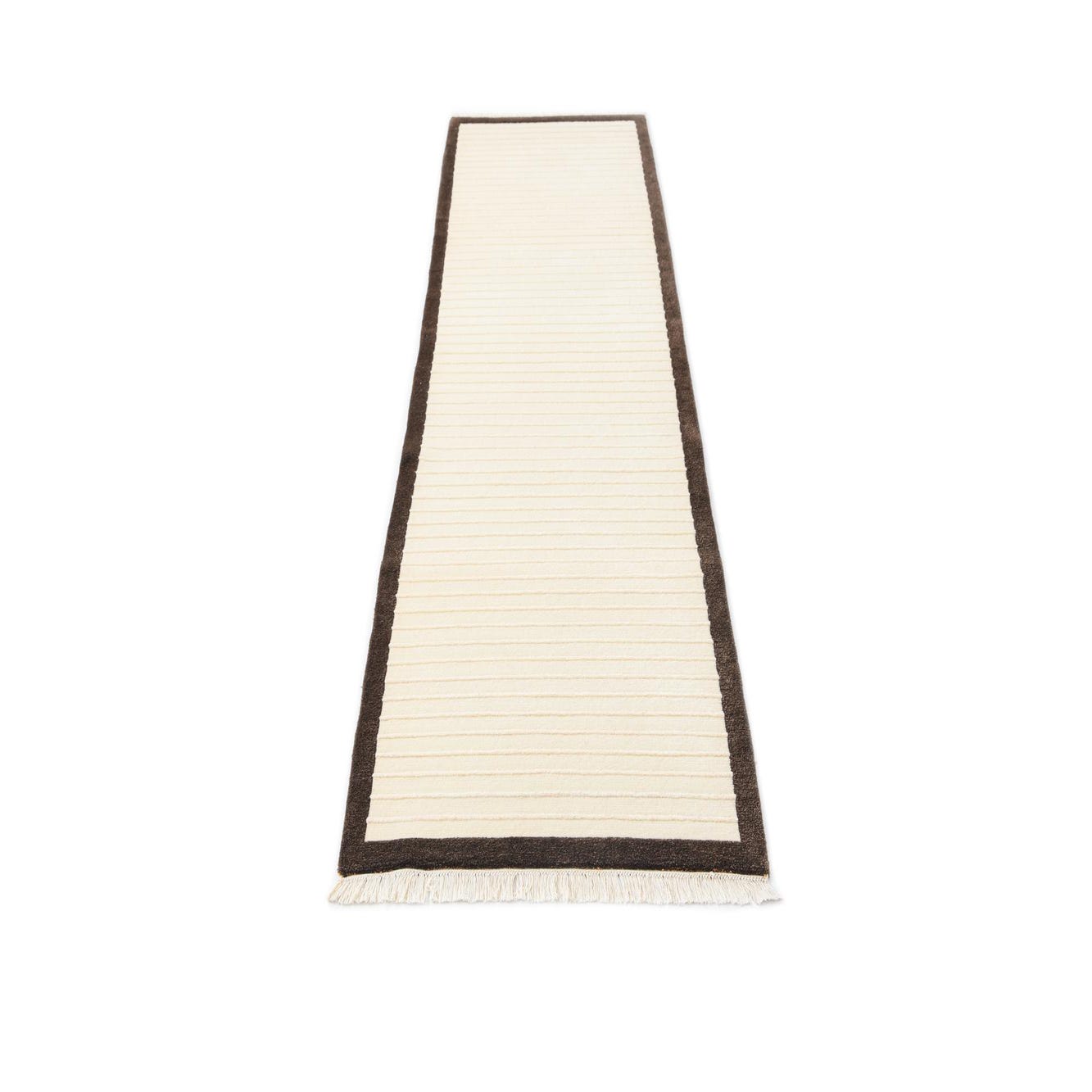 The Darya Collection offers a 10 Ft Runner hand-knotted from 100% wool, providing both durability and a plush texture underfoot. The rug presents a minimalist design with a creamy beige background and subtle lines in beige, incorporating an elegant brown border. These neutral tones and simple pattern imbue the rug with a versatile aesthetic that integrates seamlessly into various interior design styles.