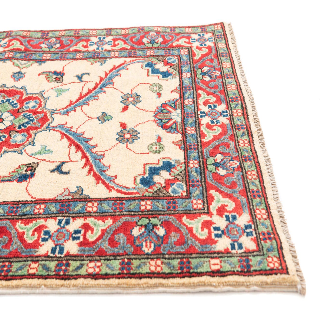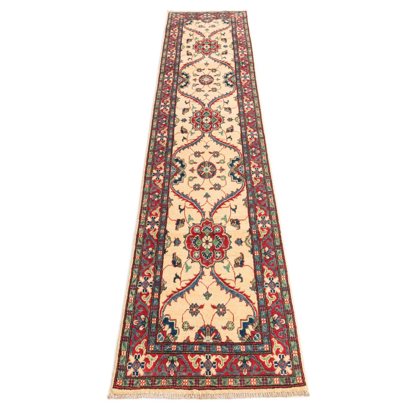 A 10 Ft runner rug from the Rugs.com Kazak collection, featuring a cream background with intricate red, blue, and green traditional floral and medallion patterns, ideal for a hallway.