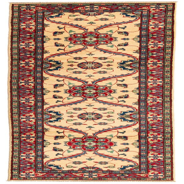 Primary color is Cream. Colors in this rug include: Cream, Blue, Brown, Red, Gold, Green, Navy Blue.