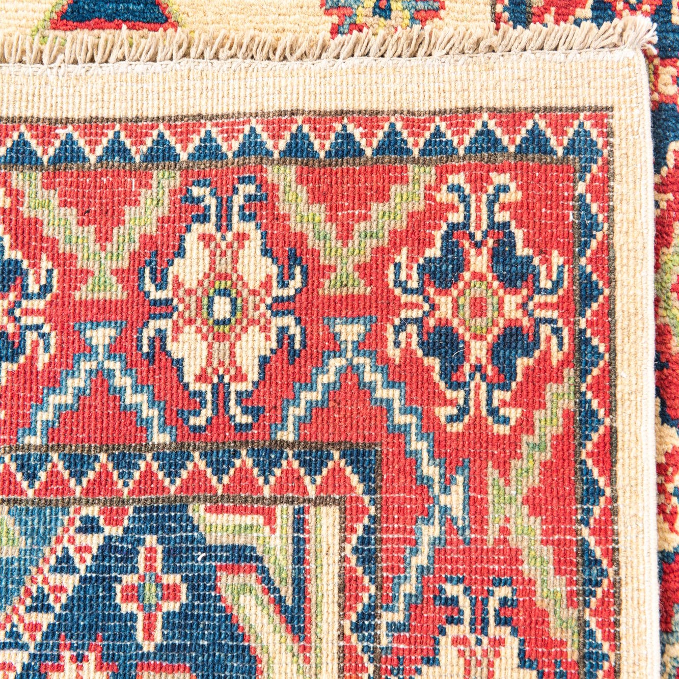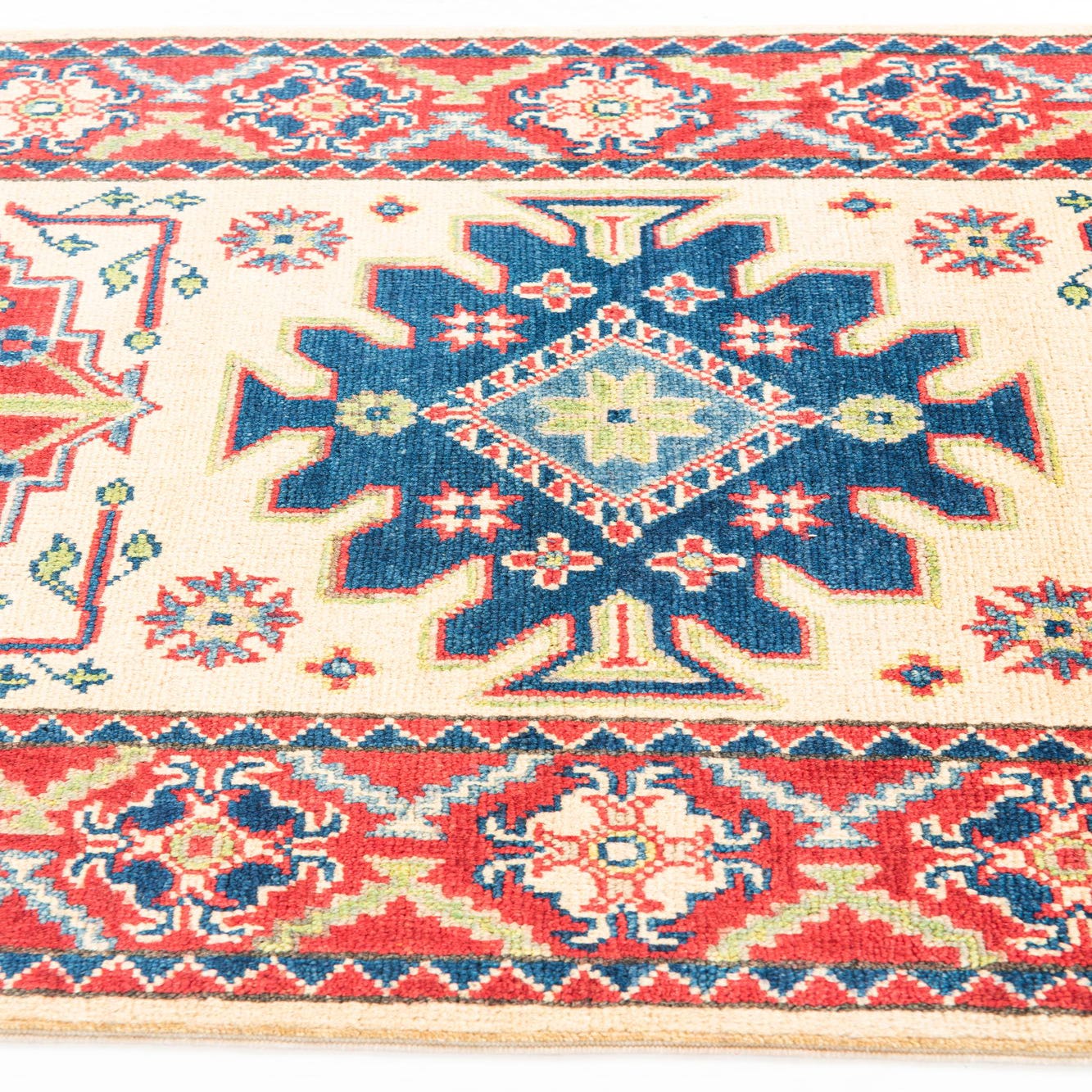 The Kazak collection presents a meticulously hand-knotted 10 ft runner that exudes traditional appeal with its geometrically inspired patterns. Crafted from 100% hand-spun wool, this runner ensures a textured finish that is tactile underfoot. Its cream background serves as a neutral canvas for the symmetrical display of vivid colors, including blue, brown, navy blue, red, and green.