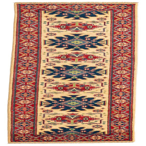 Primary color is Cream. Colors in this rug include: Cream, Blue, Brown, Navy Blue, Red, Green.