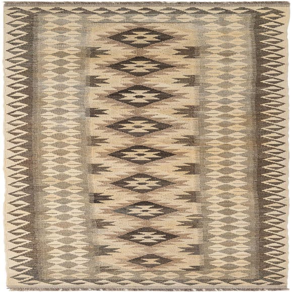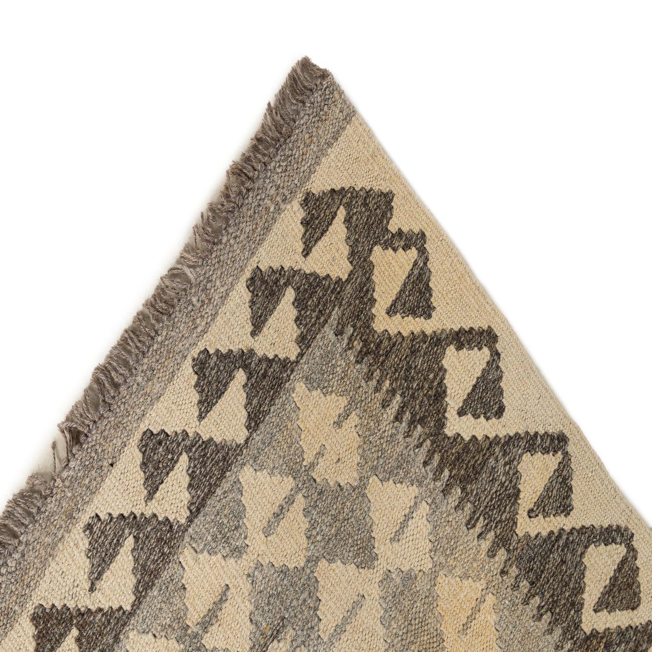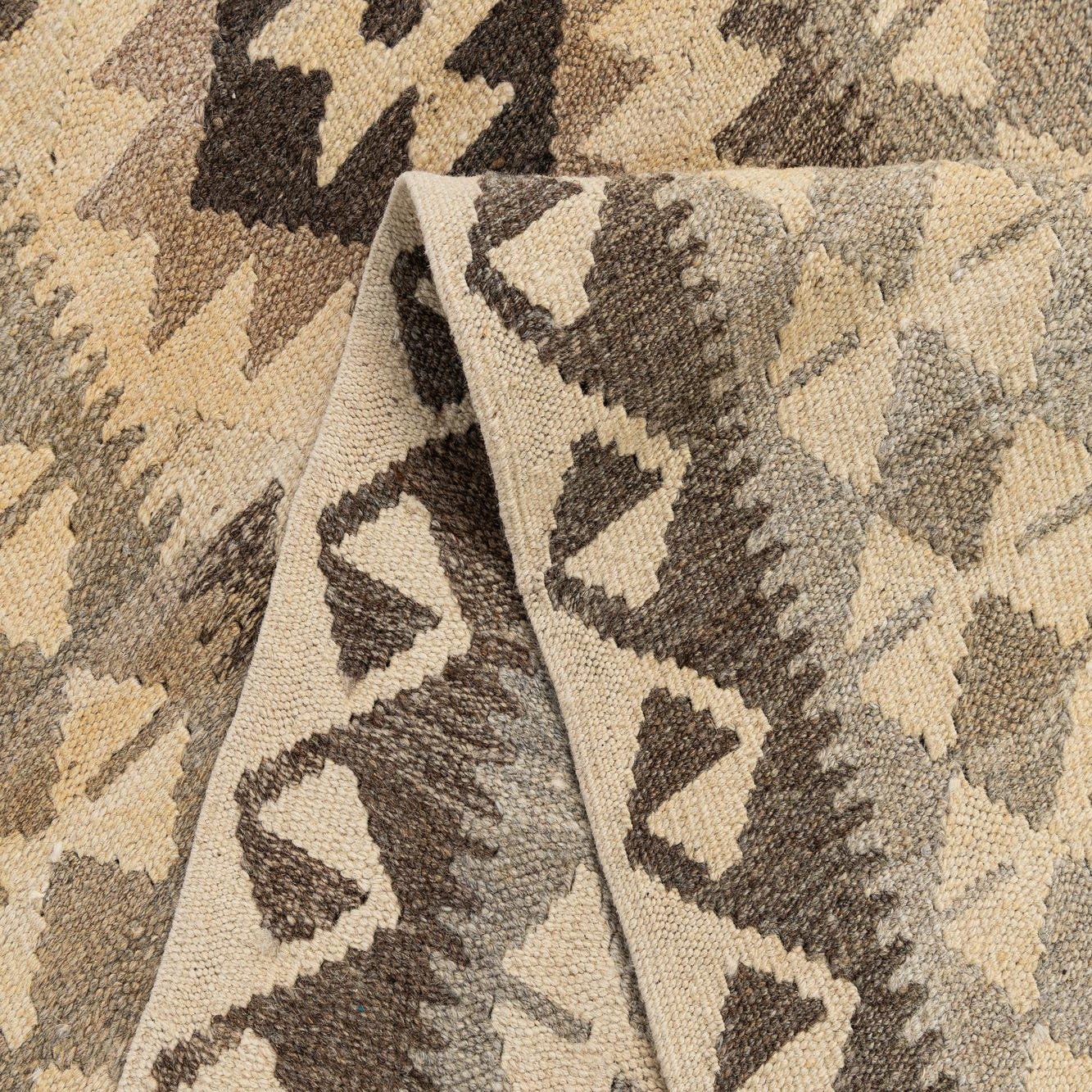 A 10 ft runner rug from the Kilim Maymana collection, featuring tribal geometric patterns in shades of ivory, cream, and brown.