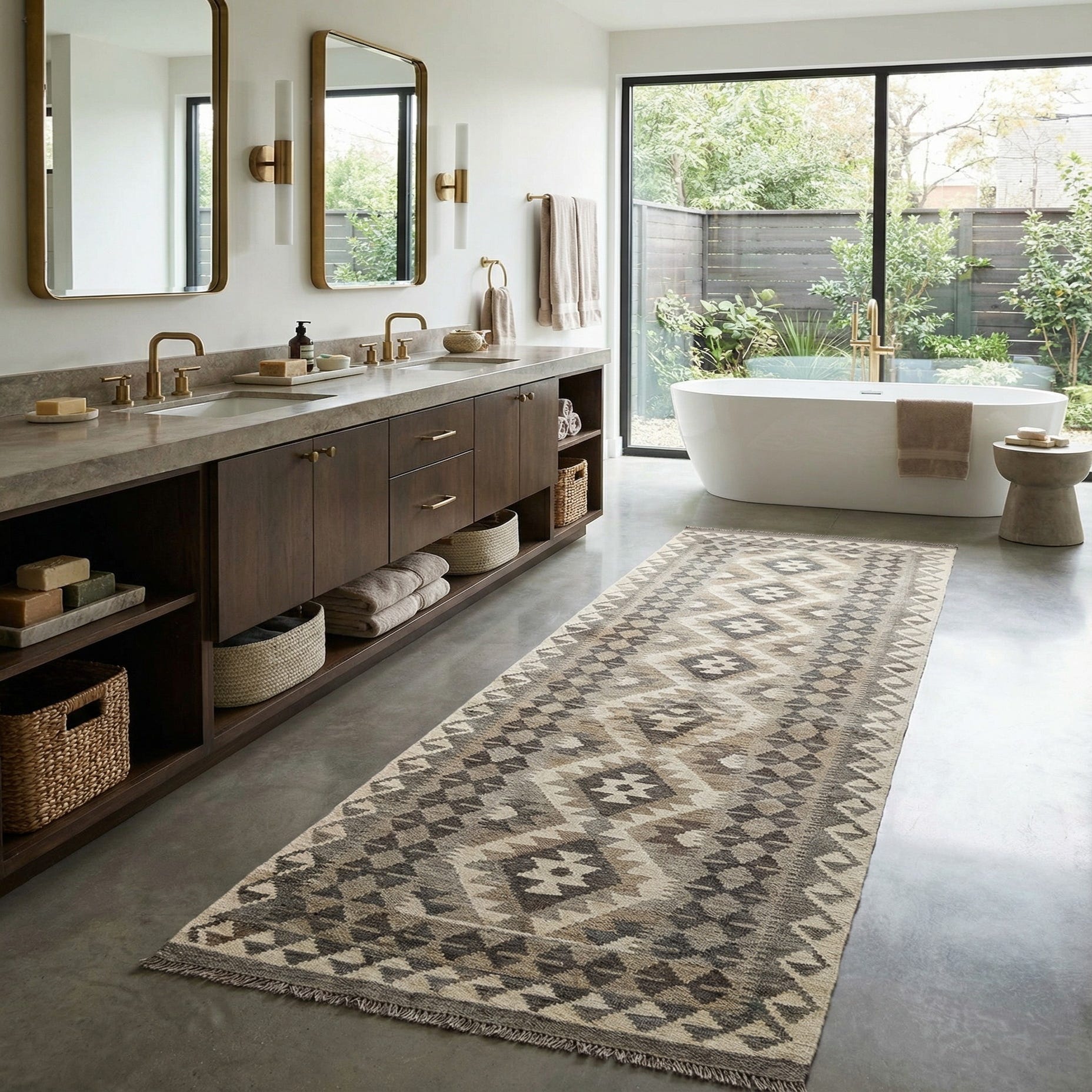 A 10 ft runner rug featuring a tribal geometric pattern in shades of ivory, cream, and dark brown, ideal for a hallway.