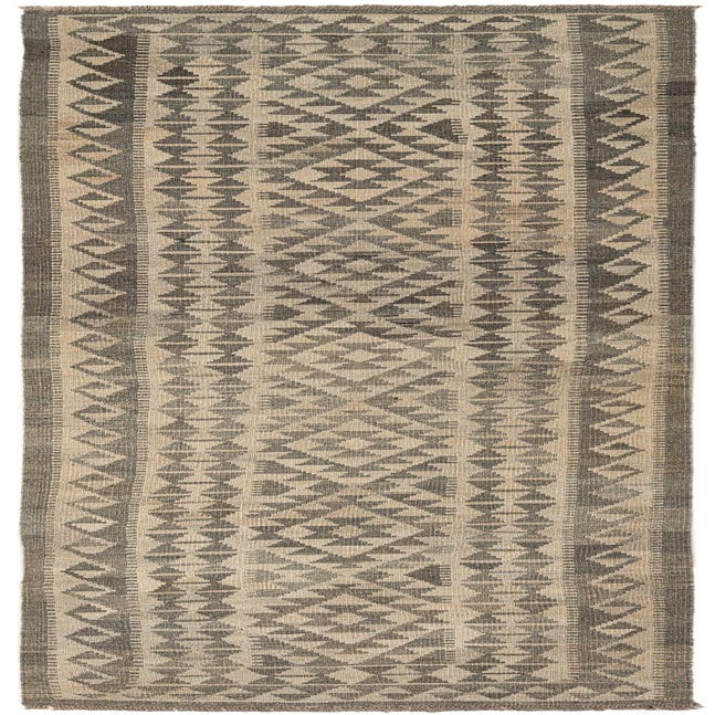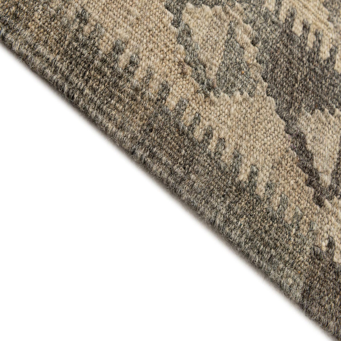 A 10 ft runner rug, the Kilim Maymana features a flatweave tribal pattern in ivories and creams, perfect for a hallway.