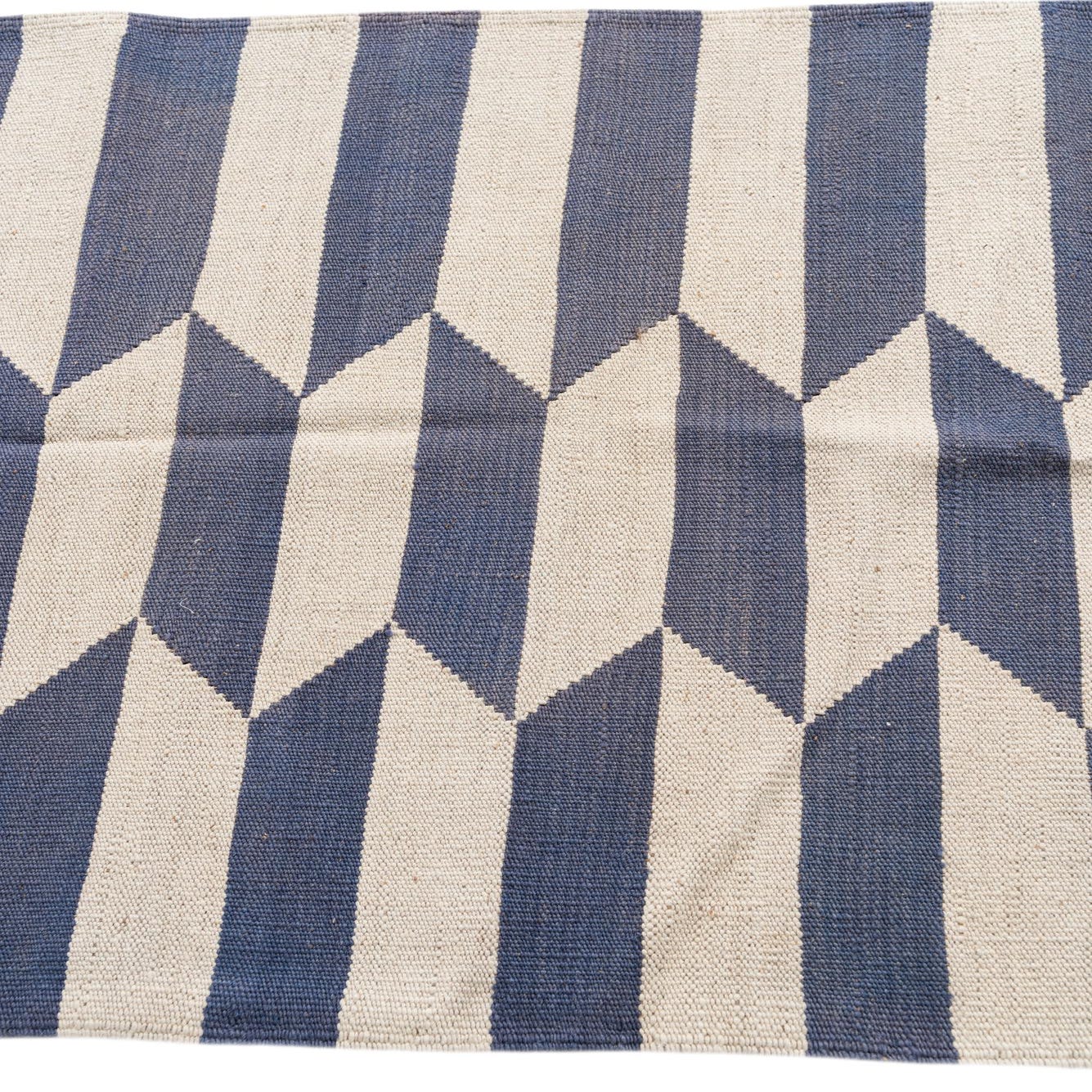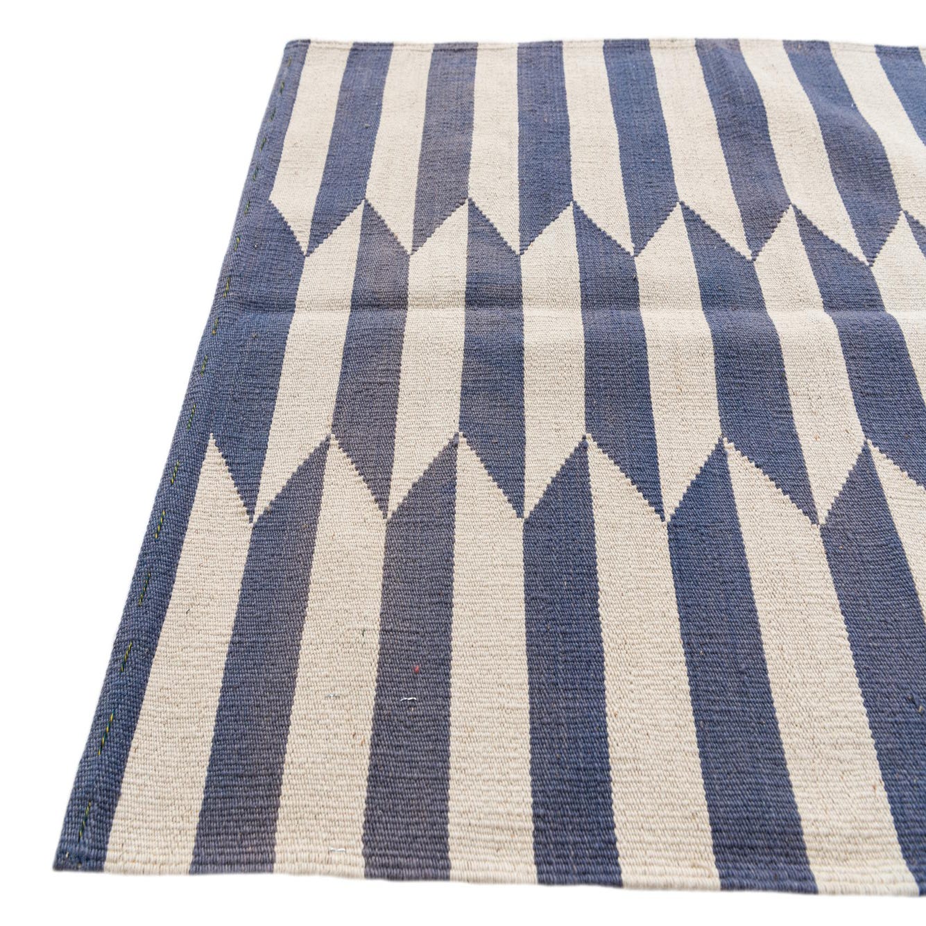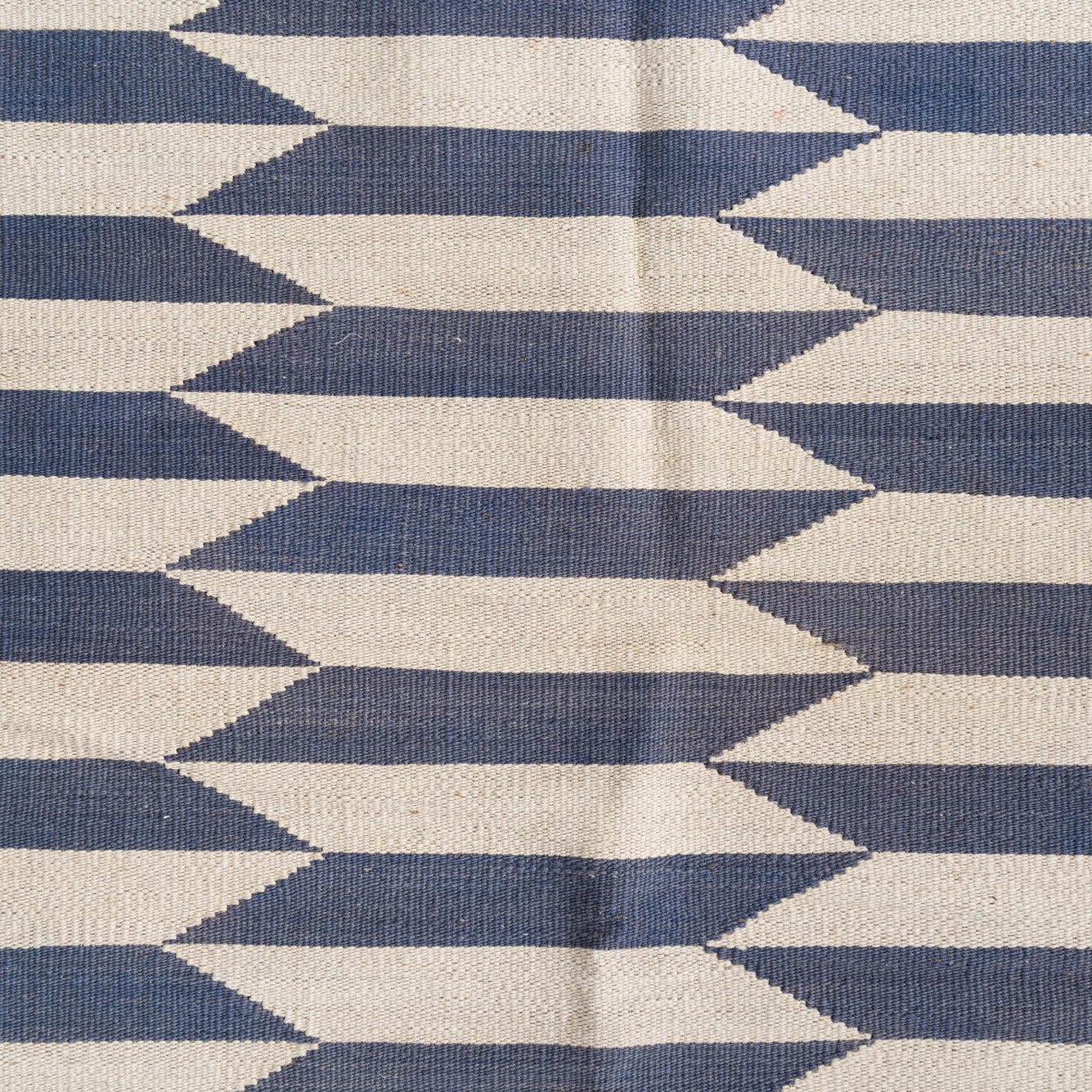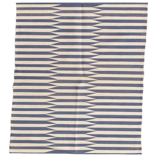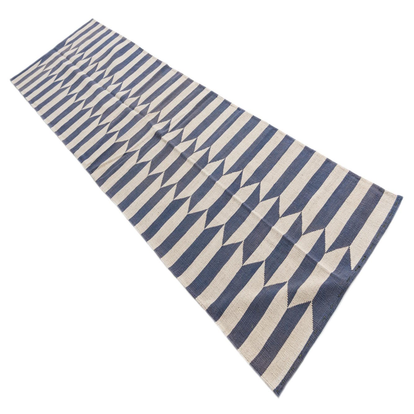 A 10 ft runner rug featuring a modern tribal pattern of alternating ivory and blue horizontal stripes with a serrated edge.