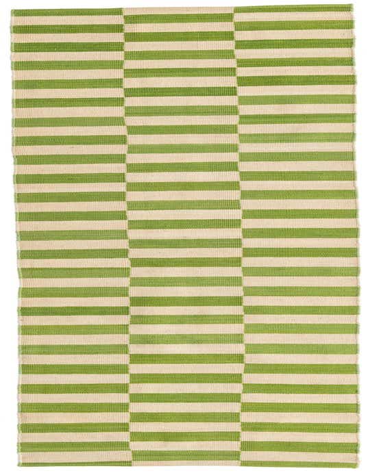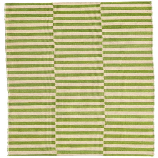 Hand-woven of 100% wool, this kilim runner presents a clean geometric pattern of stacked horizontal blocks in light green against a cream background. The alternating bands form narrow vertical columns that create a modern checkerboard rhythm, while the flat-weave construction produces a low-profile surface with a firm, tactile feel. Natural wool fibers give the texture subtle variation and a warm hand underfoot.
