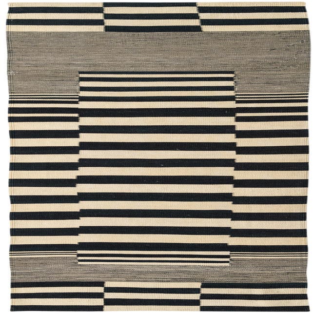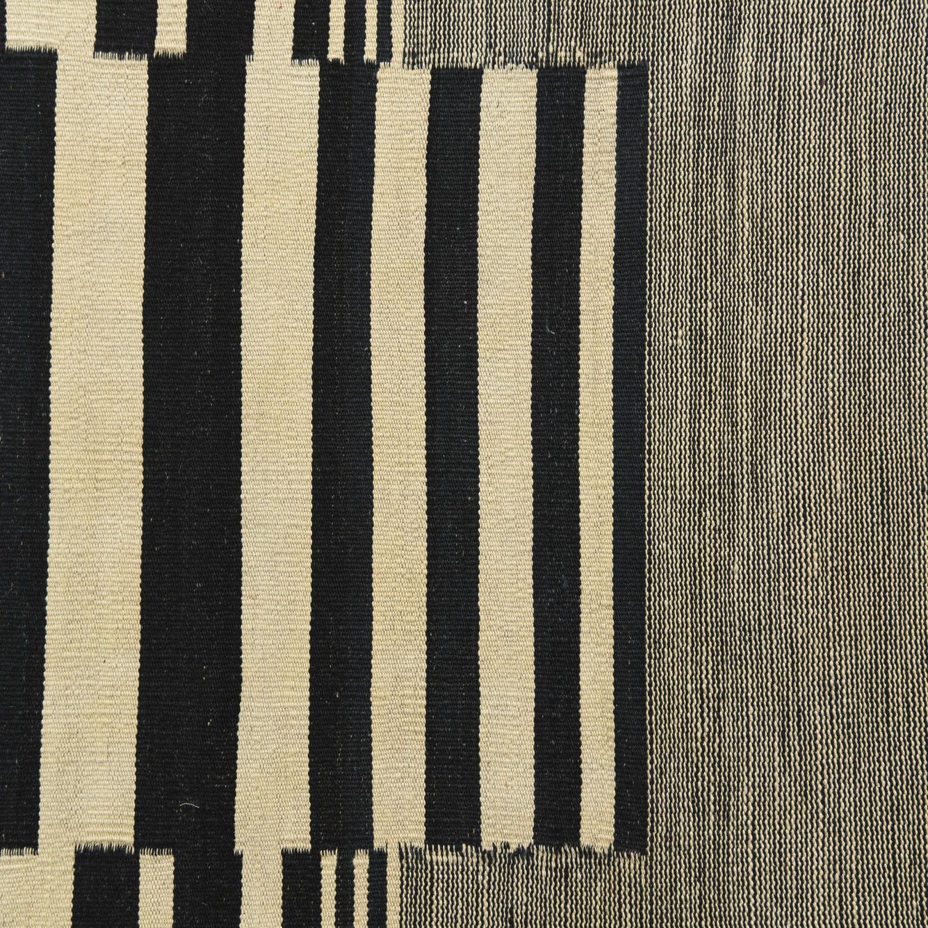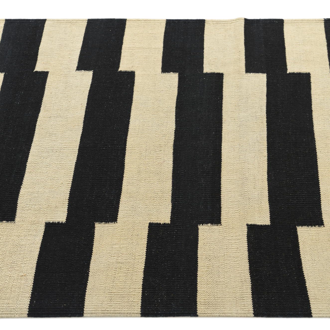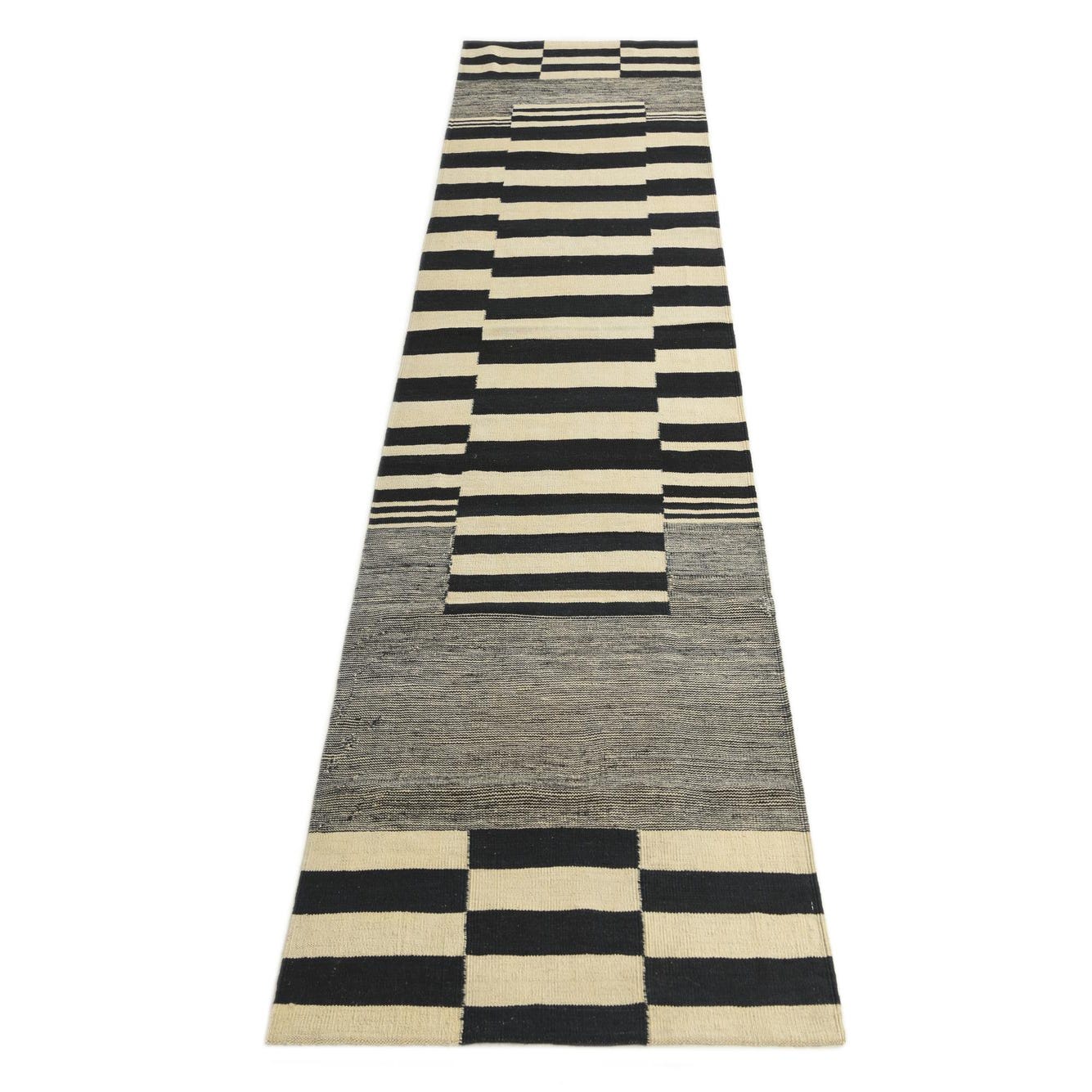 A 10 Ft runner rug from the Kilim Modern collection, featuring a tribal abstract pattern with black and ivory stripes and solid blocks.