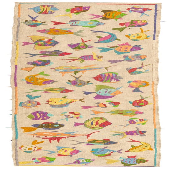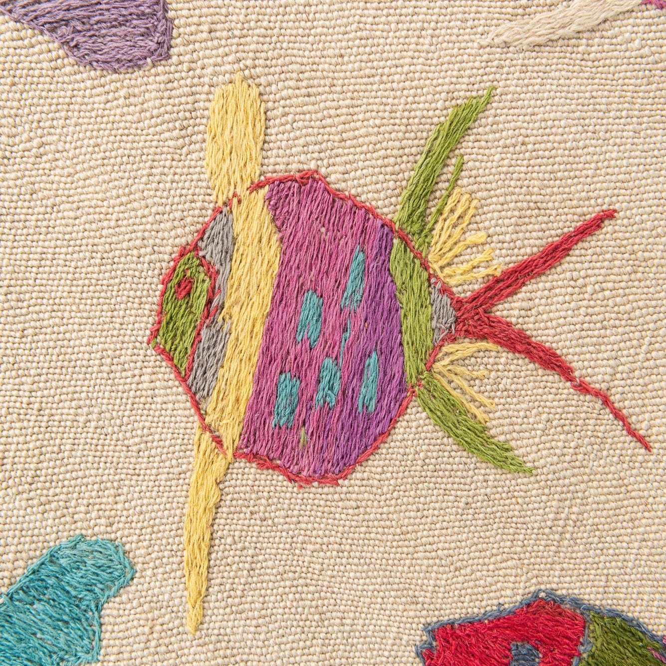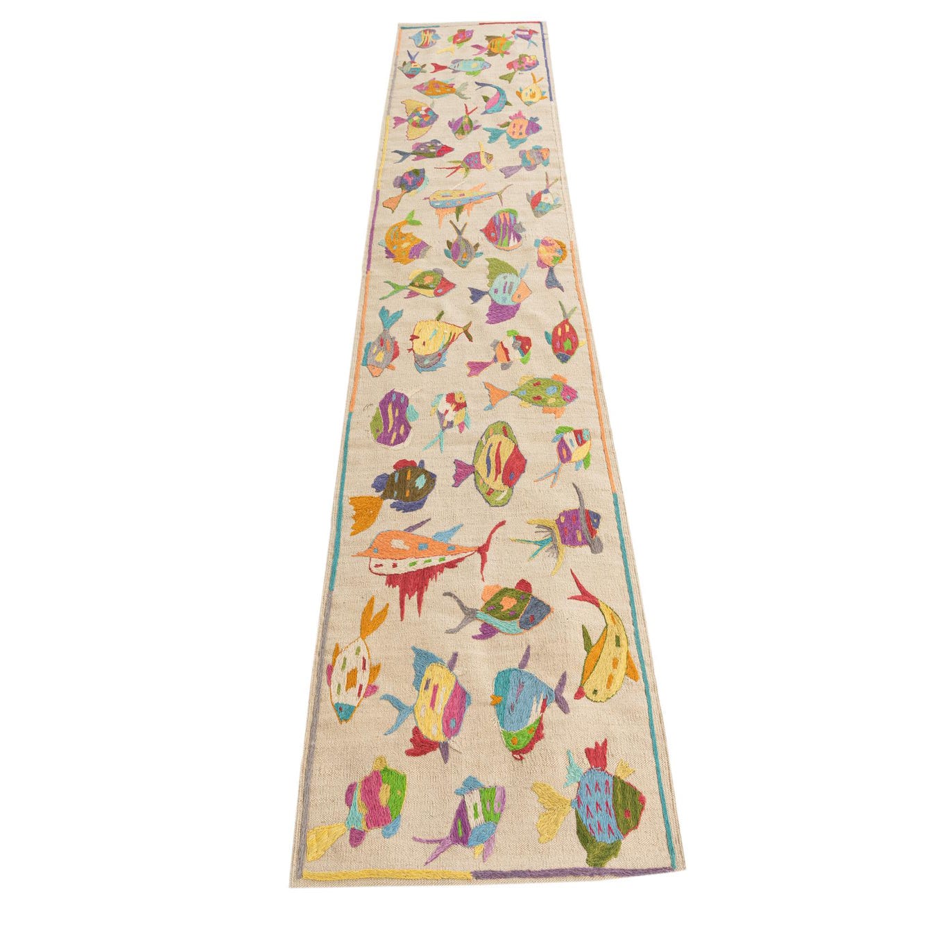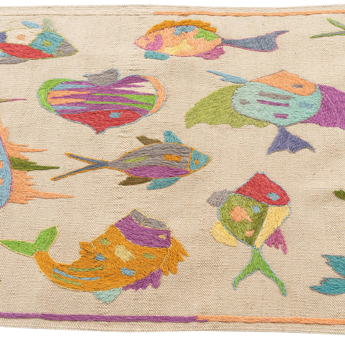A cream field sets a calm backdrop for a lively arrangement of hand-stitched fish motifs in light blue, light green, olive, orange, red, violet, beige and brown. Each fish is uniquely colored and patterned, their playful forms scattered across the length of the runner with a narrow, multicolored edge that frames the composition. Hand woven of 100% wool, the piece has a low-profile, flatweave base with slightly raised embroidered motifs—the ground feels firm underfoot while the stitched areas add a pleasant tactile contrast when you run your hand across the surface.