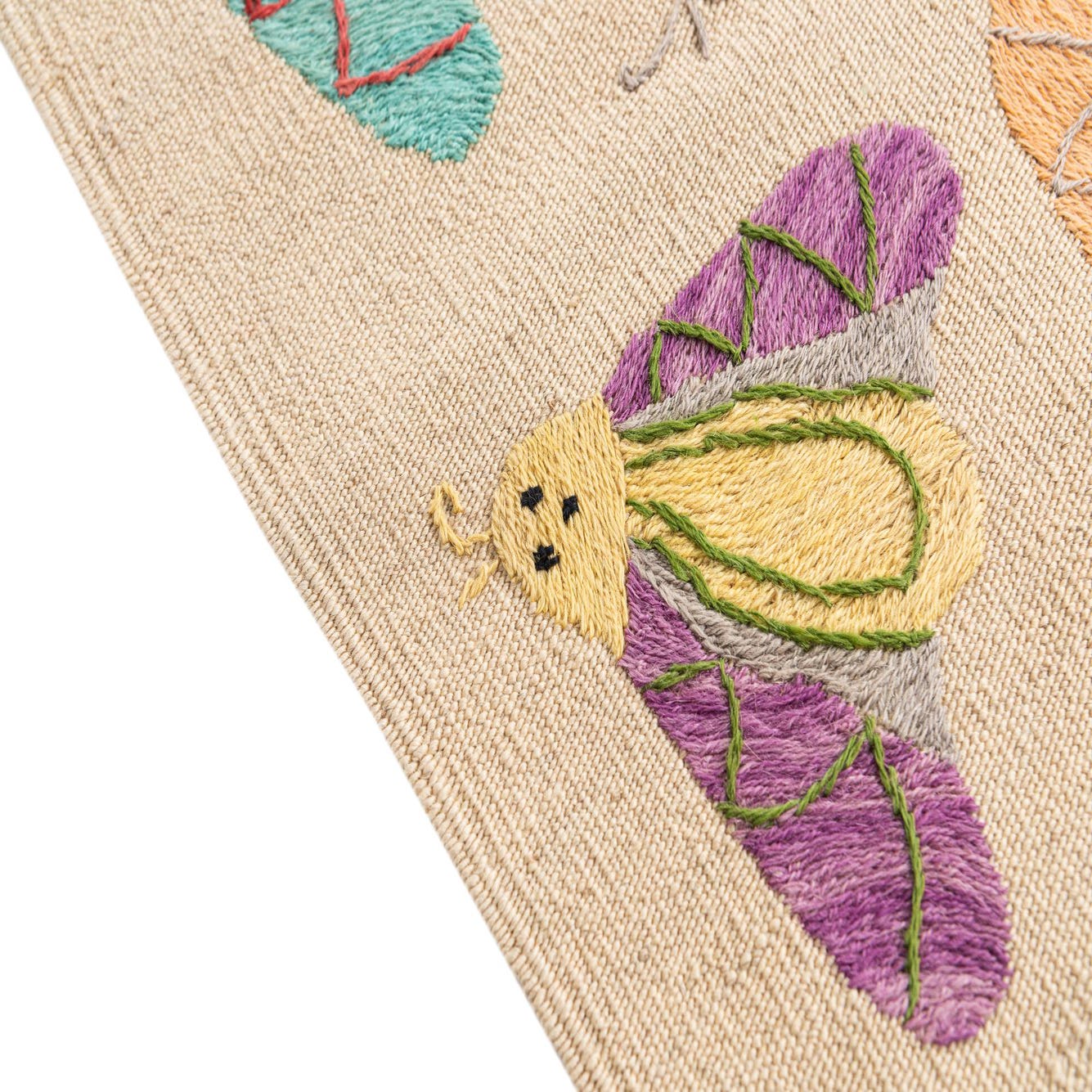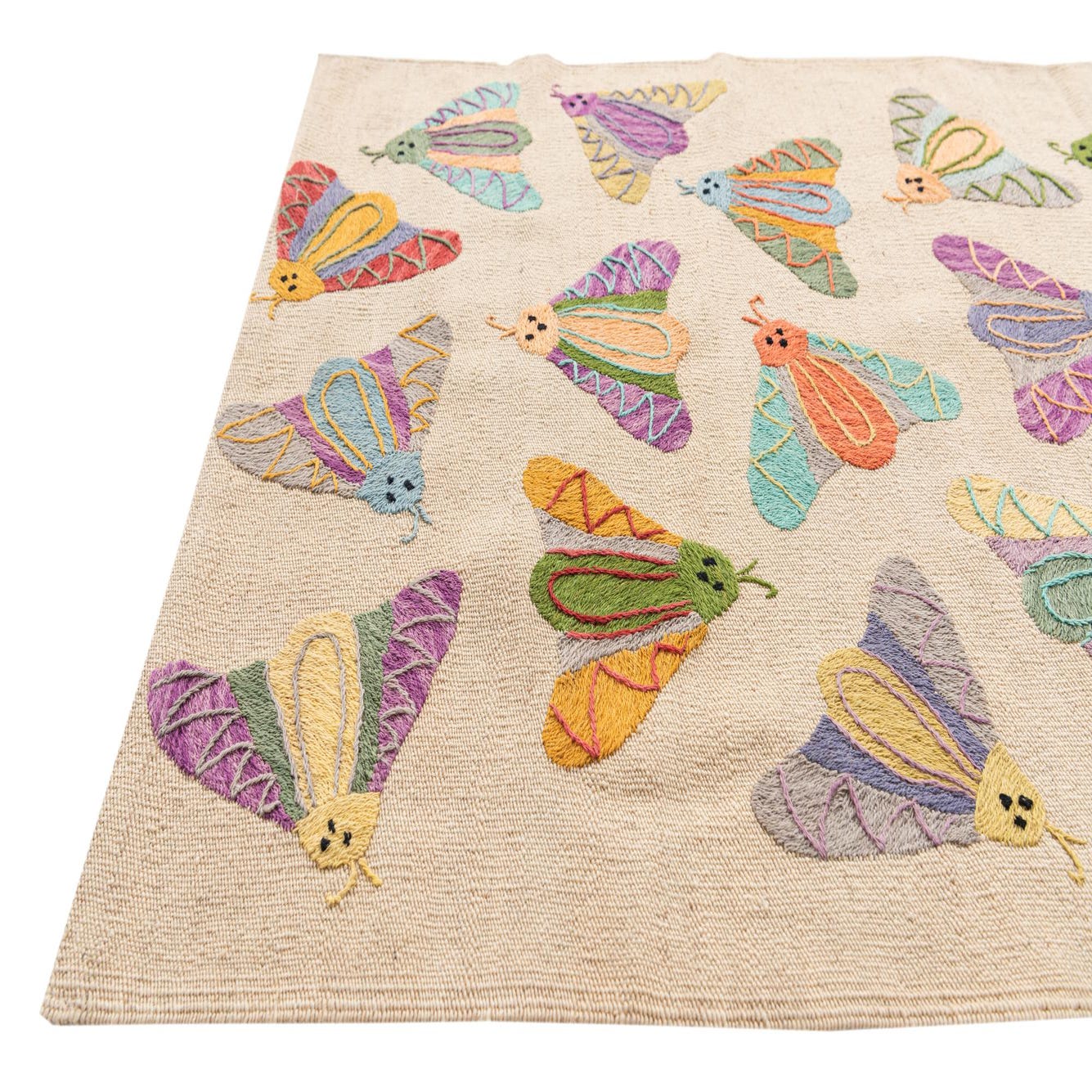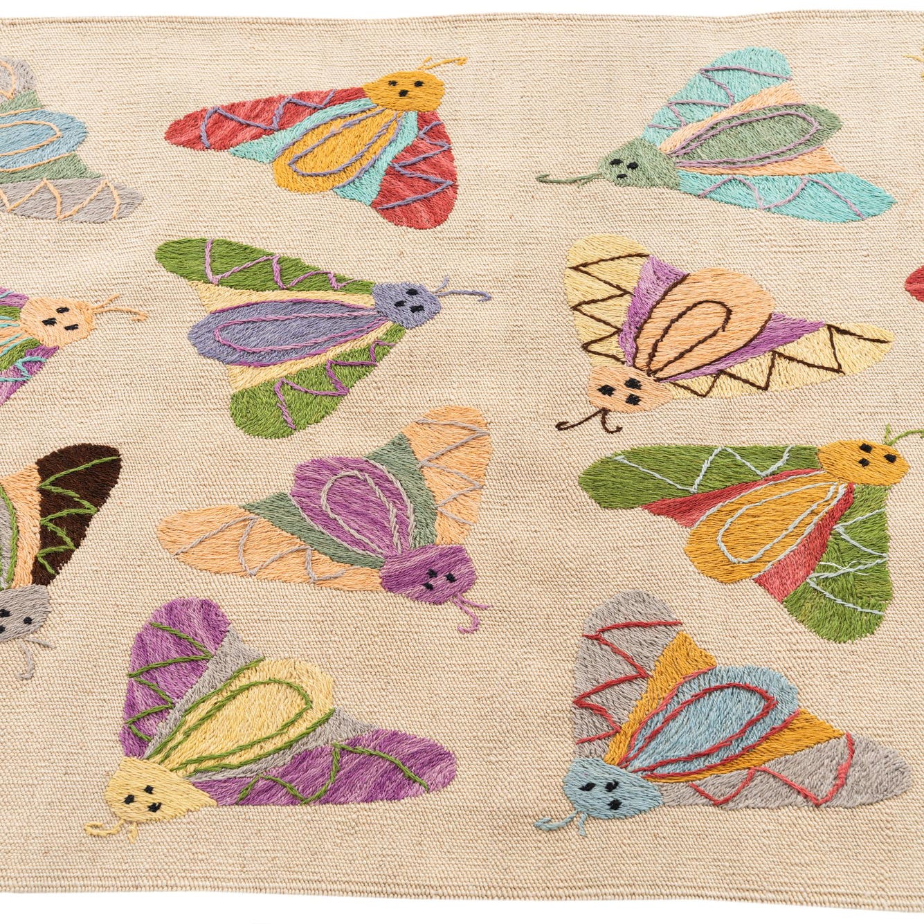 A 10 ft runner rug with a cream background, featuring colorful, stylized moth patterns in various hues like purple, orange, blue, and green, perfect for a hallway.