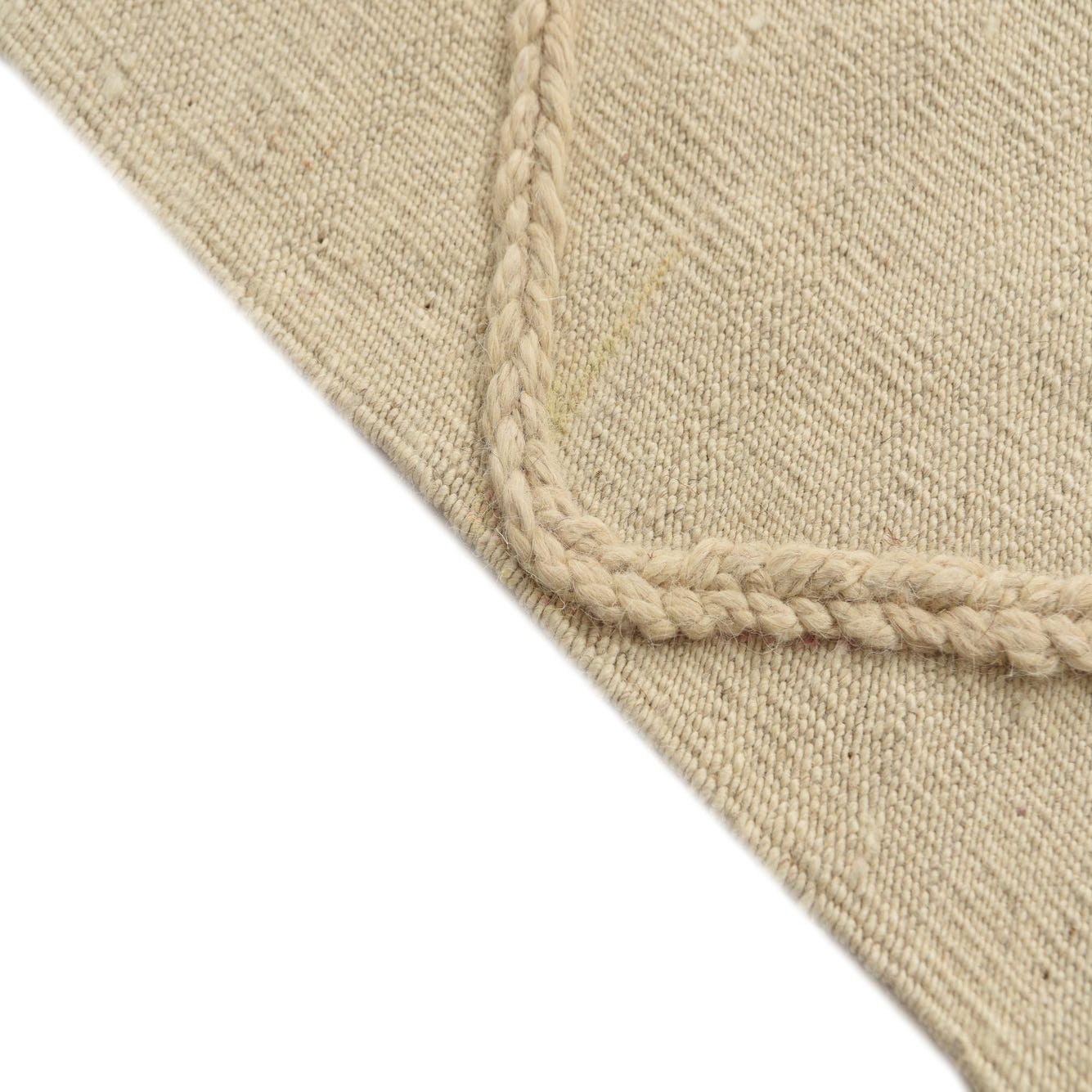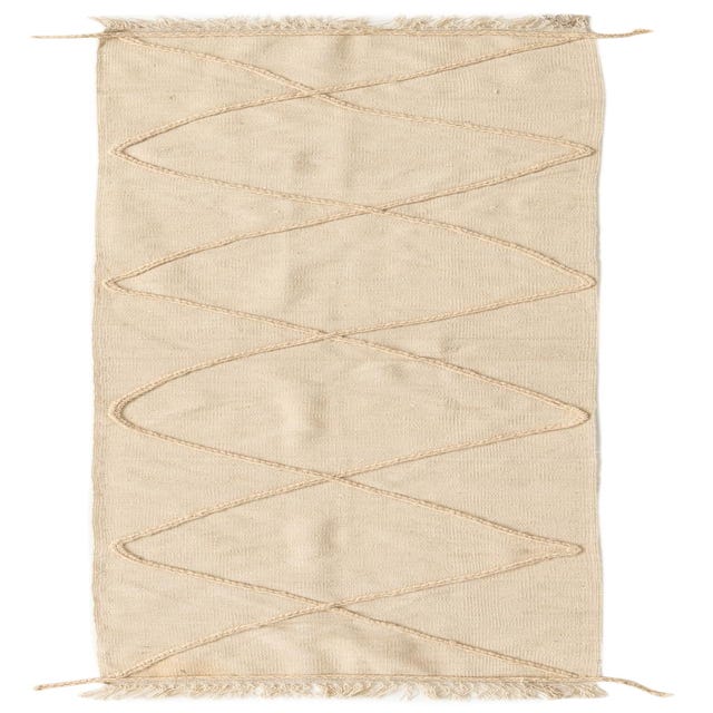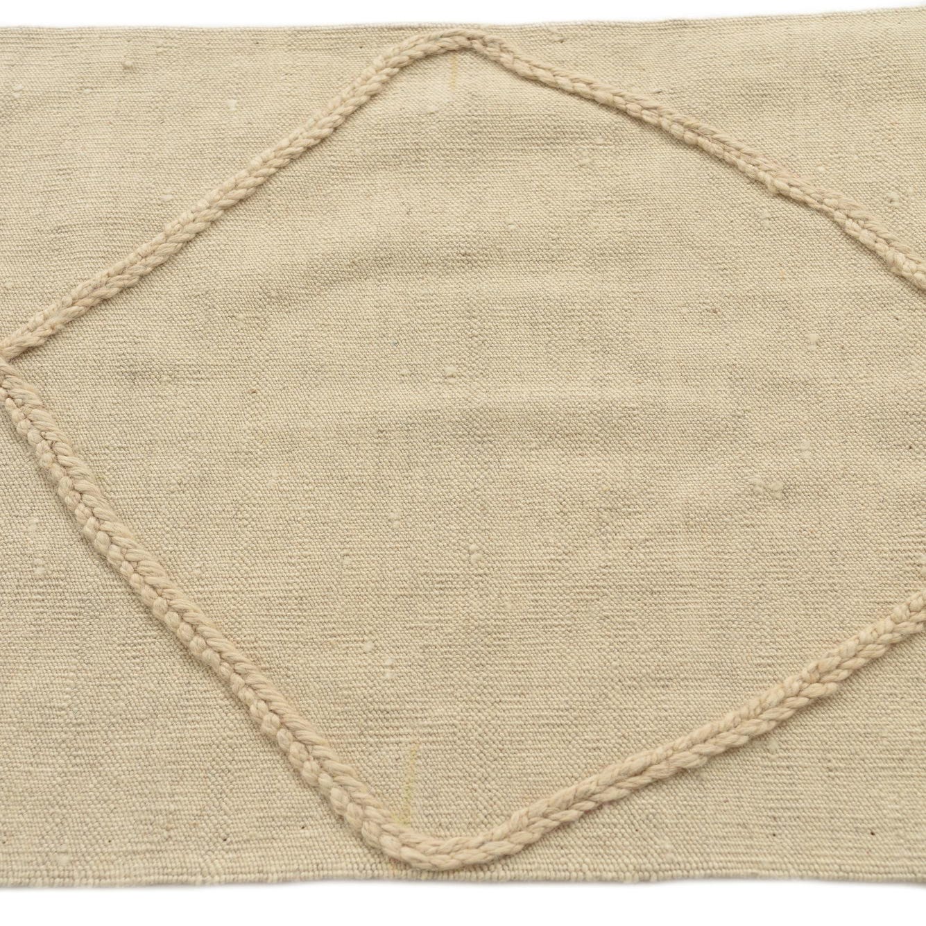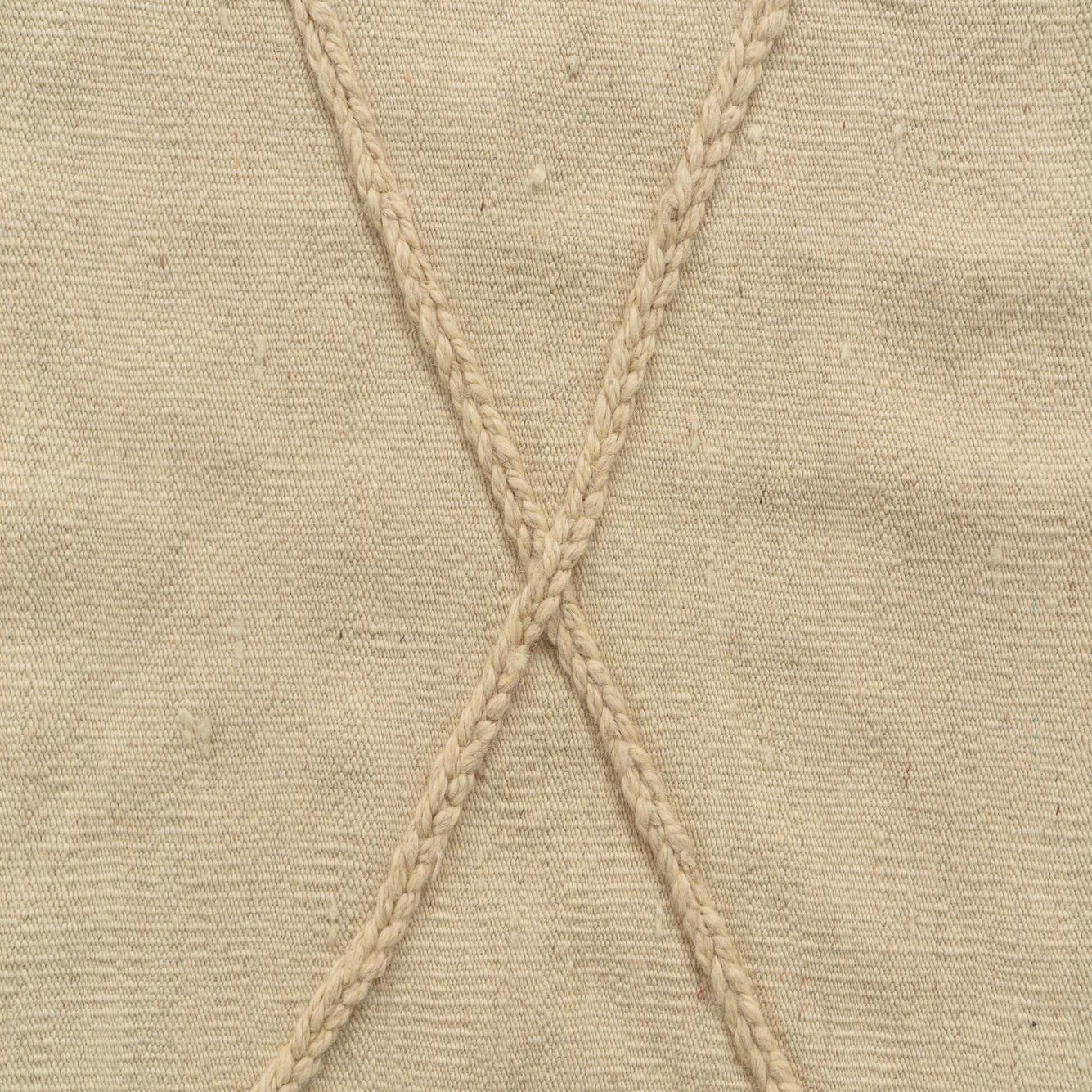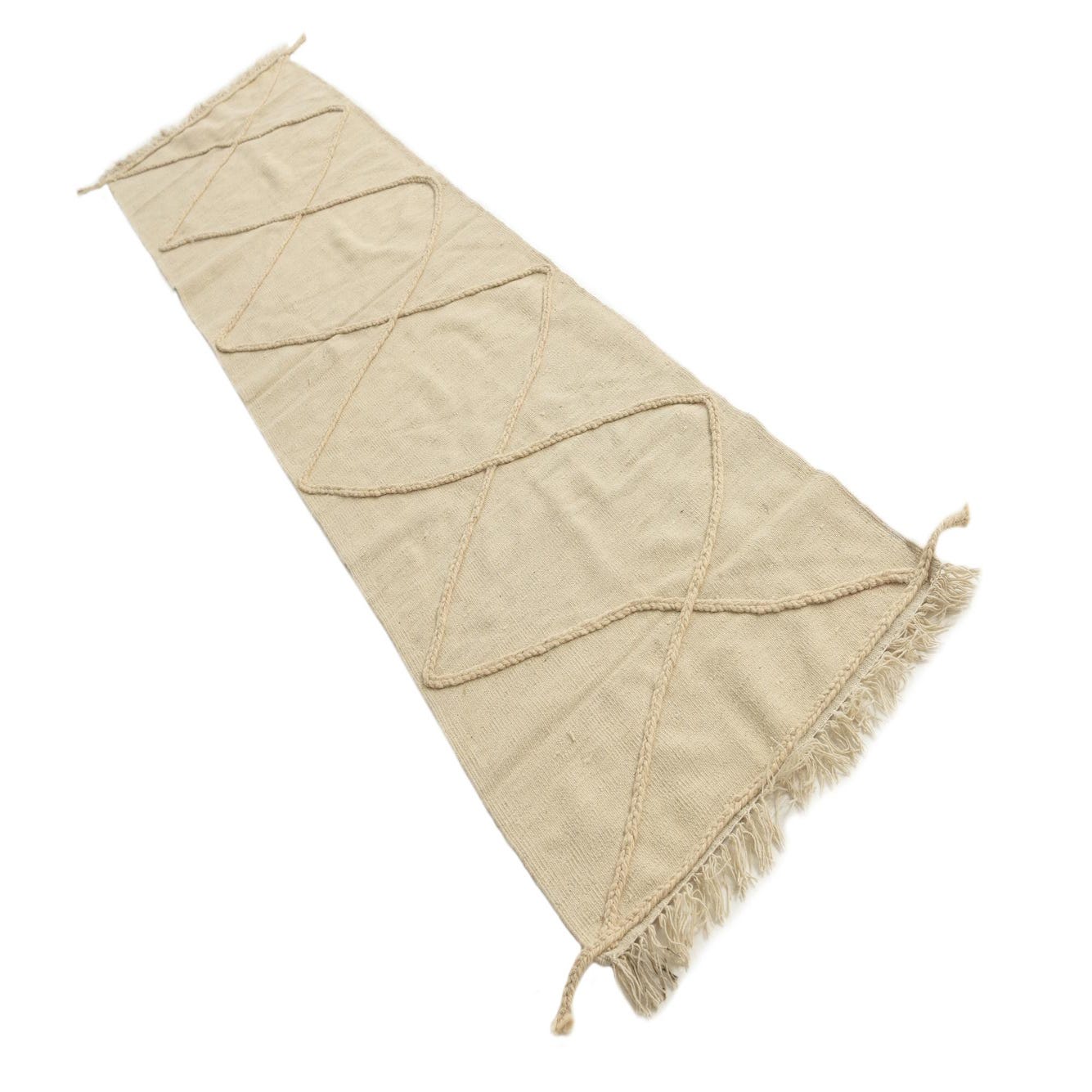 A 10 ft runner rug in ivory wool, featuring a modern tribal geometric pattern with braided accents and fringed ends.