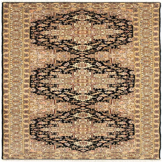 A 10 ft runner rug with a black field and intricate ivory, cream, and peach Persian floral patterns, ideal for a hallway.