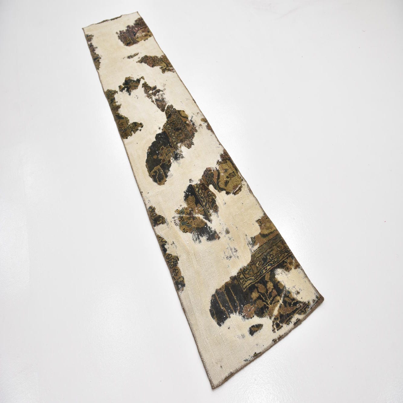 A 10 ft runner rug with an ivory background and distressed Persian-style patterns in brown, black, and blue.