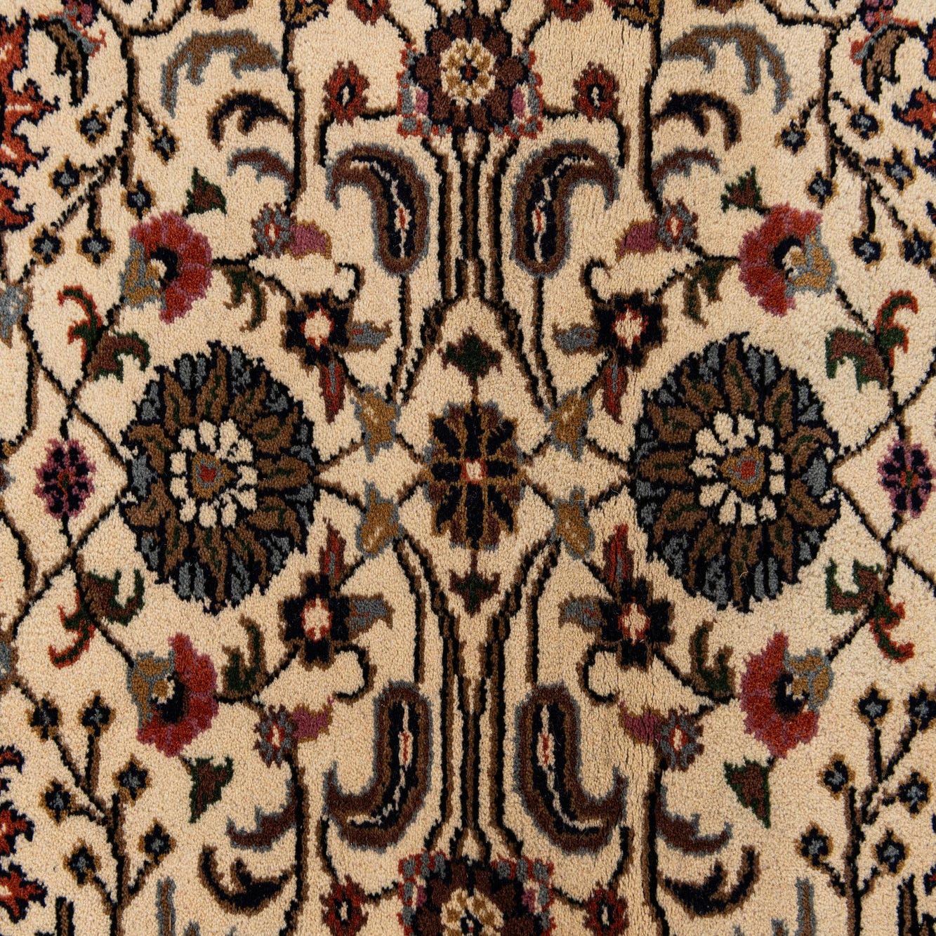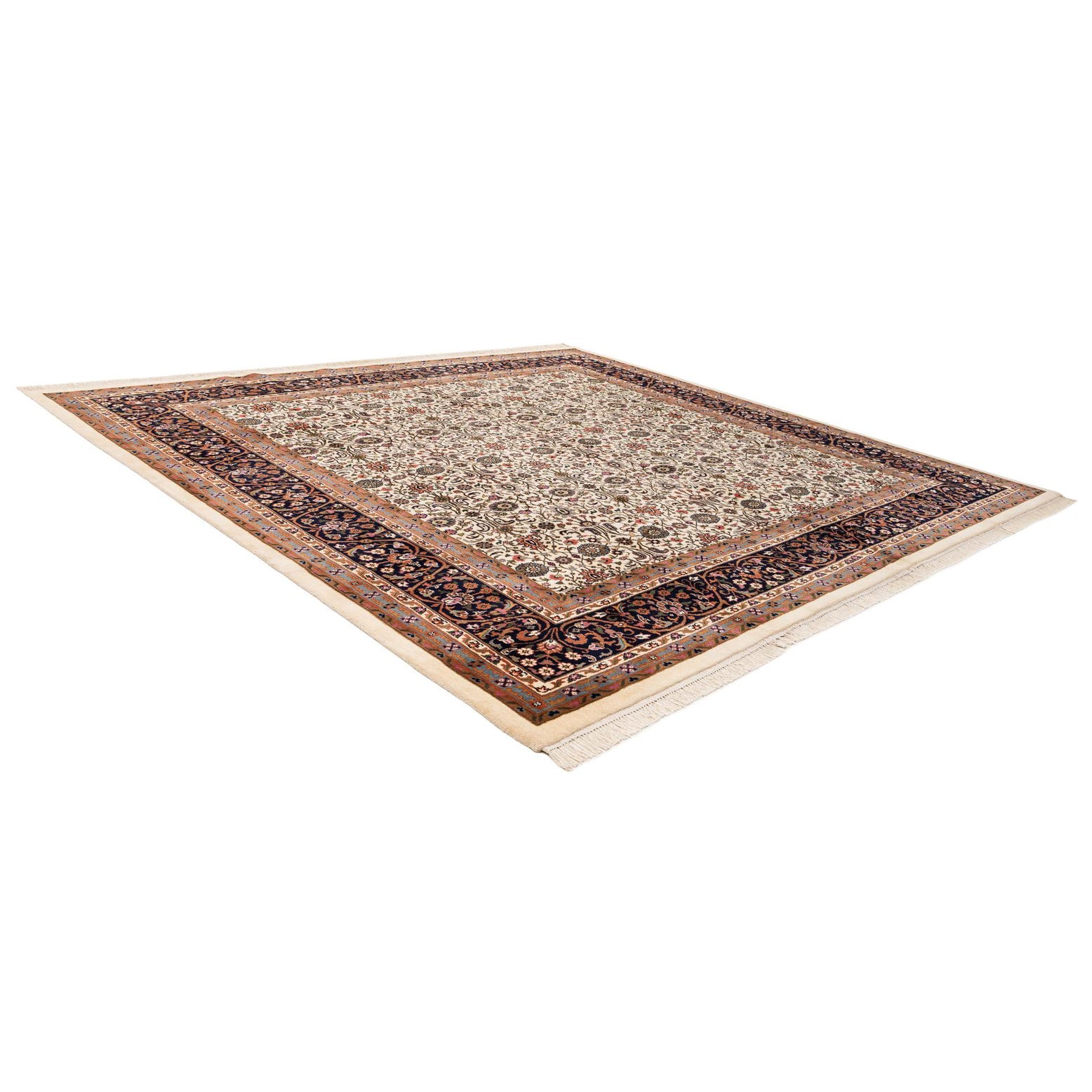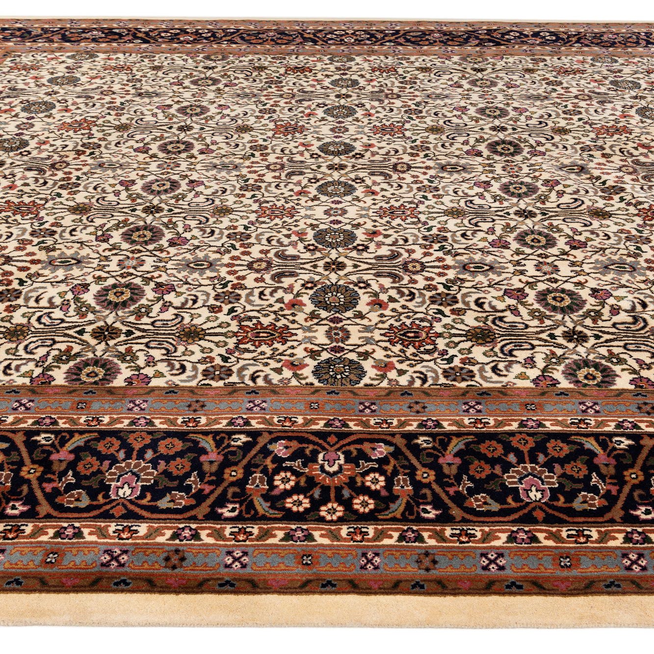 A classic Persian-inspired design unfolds across a cream field, where a tightly packed floral and vine allover pattern draws the eye. Rows of rosettes and palmettes interlock in beige, brown, gray and olive, while navy blue and soft pink accents punctuate the motif for depth and contrast. The rug is framed by a series of guard borders, the outermost a rich navy band with scrolling floral details that ground the lighter central field and add visual weight at the edges.