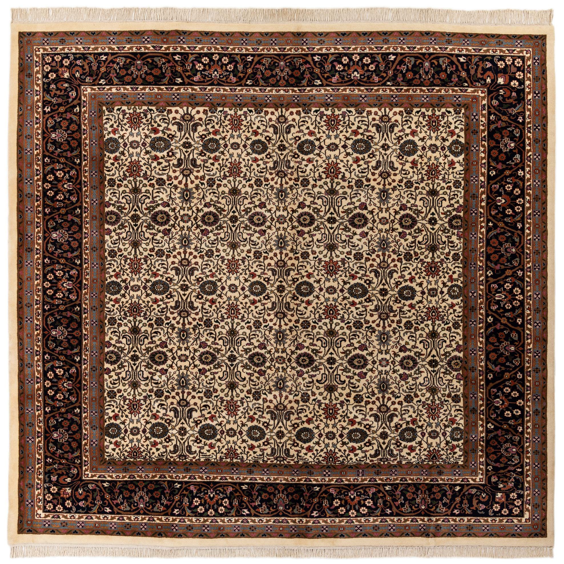 A square 9' 11 x 10' 2 ivory and black traditional Oriental rug with intricate floral patterns and a wide border.