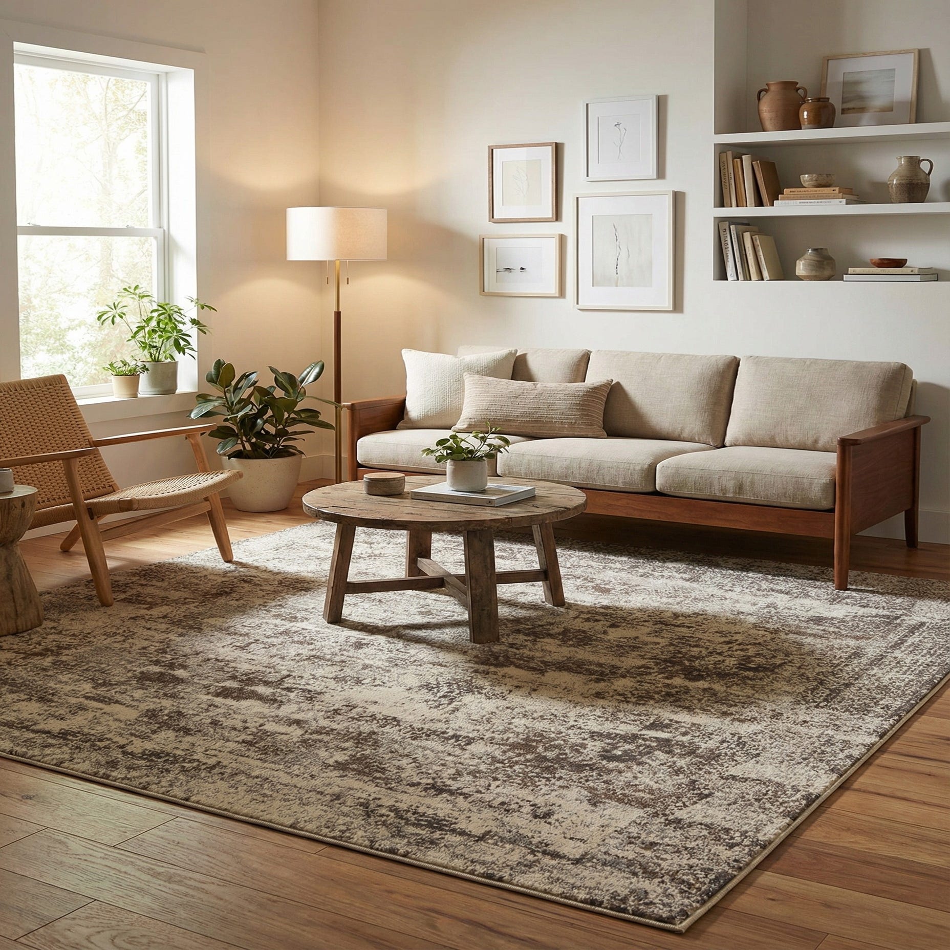 The rug’s transitional style pairs easily with both modern and classic settings — place it beneath a sofa group to anchor a living room, layer it under a dining table to soften hard floors, or use it in a home office to introduce subtle warmth. It complements warm wood furniture, leather seating, and cool gray upholstery, and works well with industrial metal accents or relaxed, farmhouse-inspired interiors.