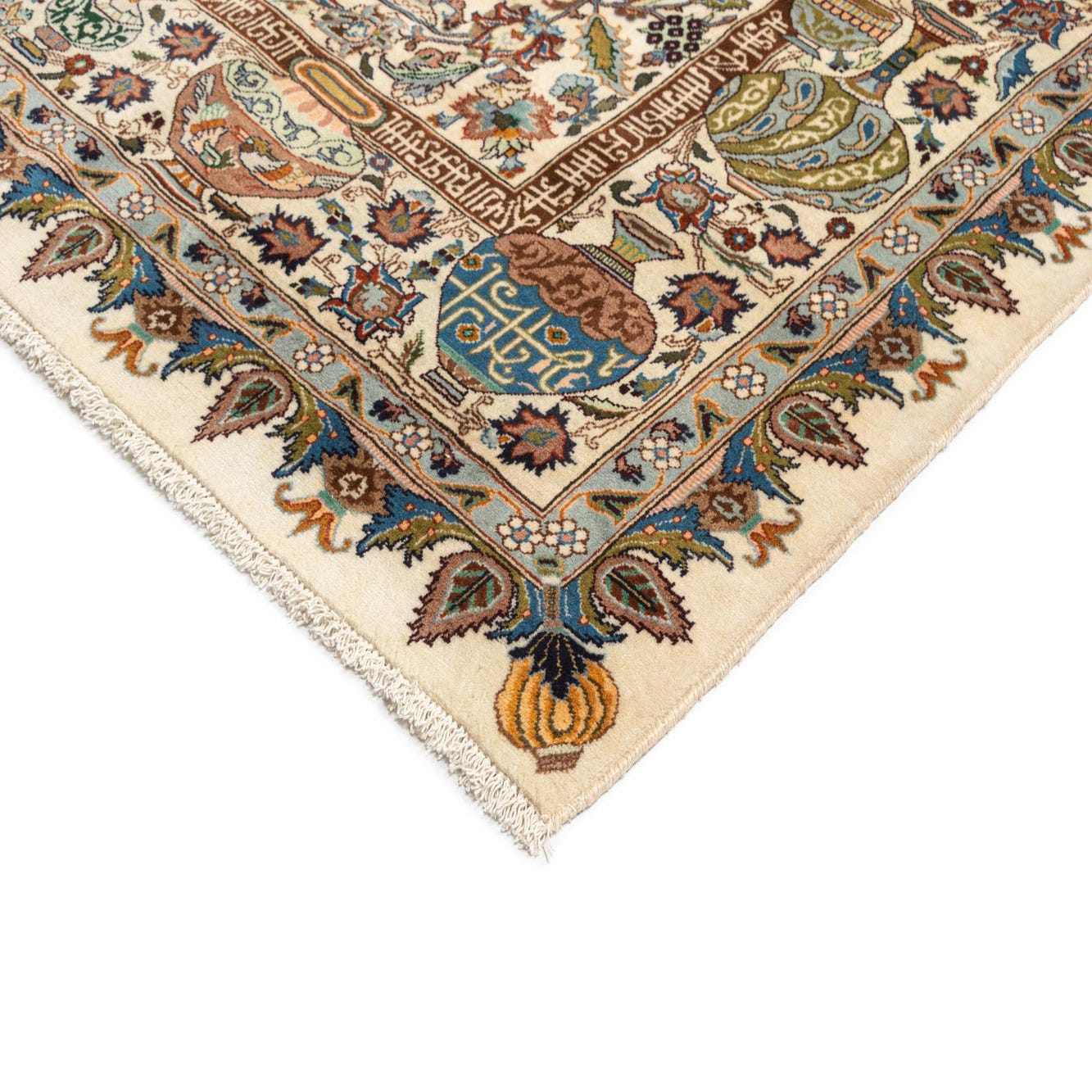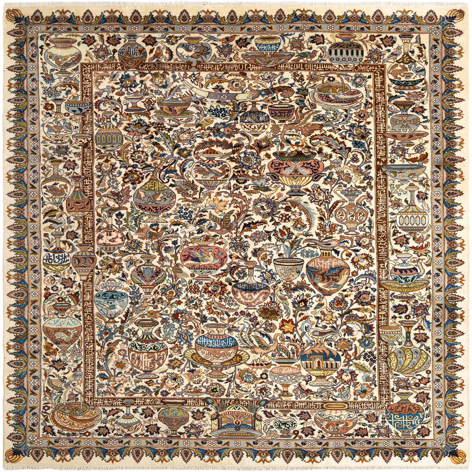 A 10x13 rectangular Persian rug in ivory and cream, featuring an intricate pattern of colorful vases, birds, and floral motifs.