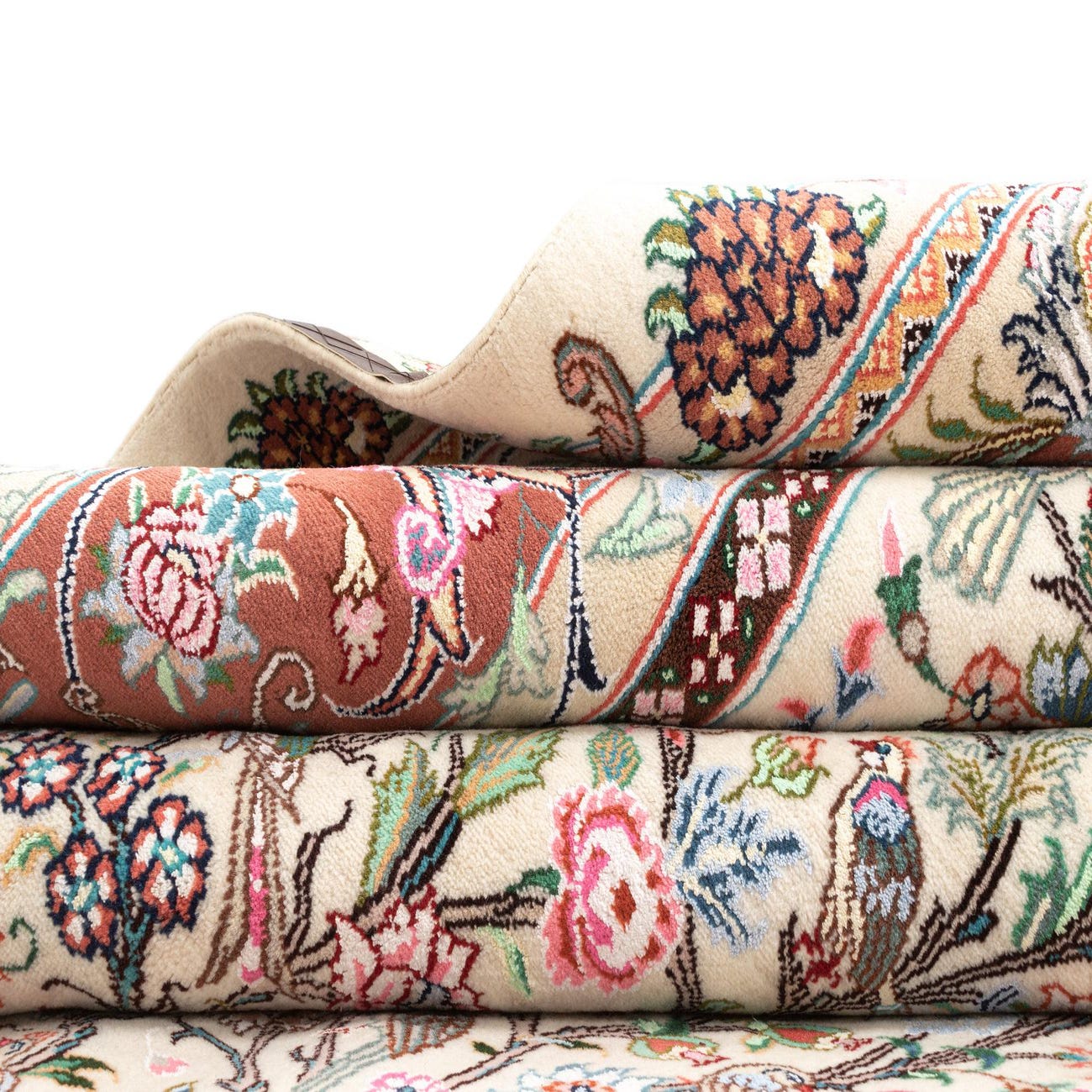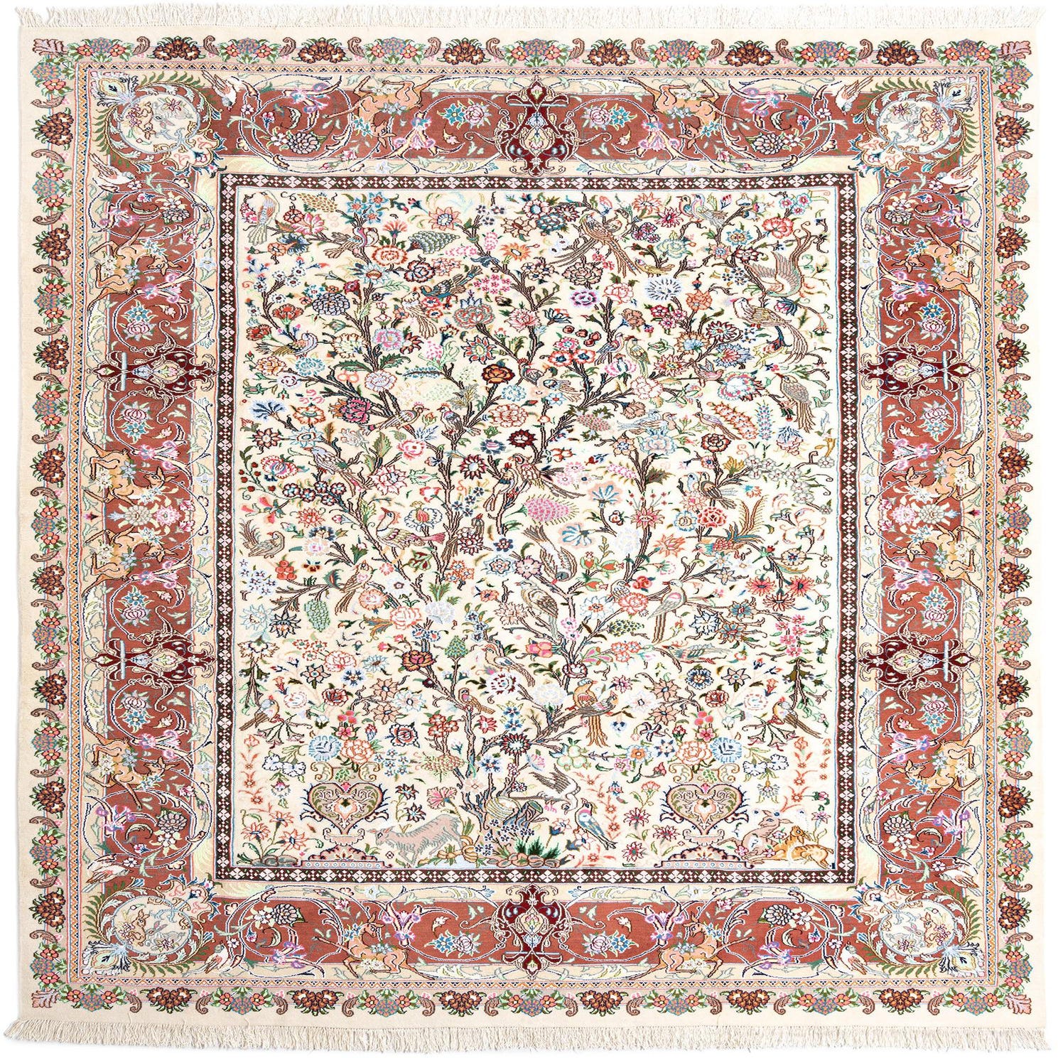 A 10x13 rectangular ivory Persian wool rug with a detailed tree-of-life pattern and a rust-colored border.