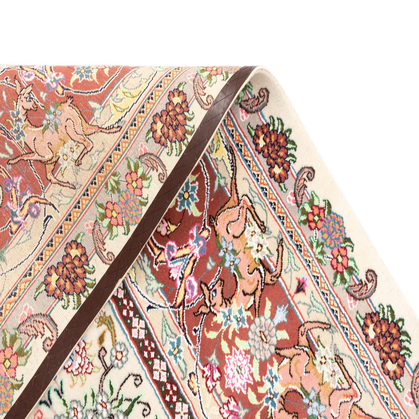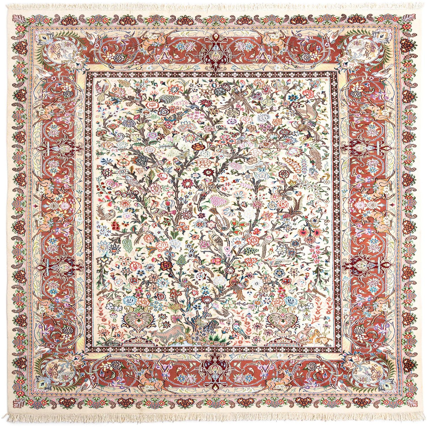 A large 10x13 rectangular Persian rug with an ivory field, intricate floral and bird patterns, and a rust-colored border.