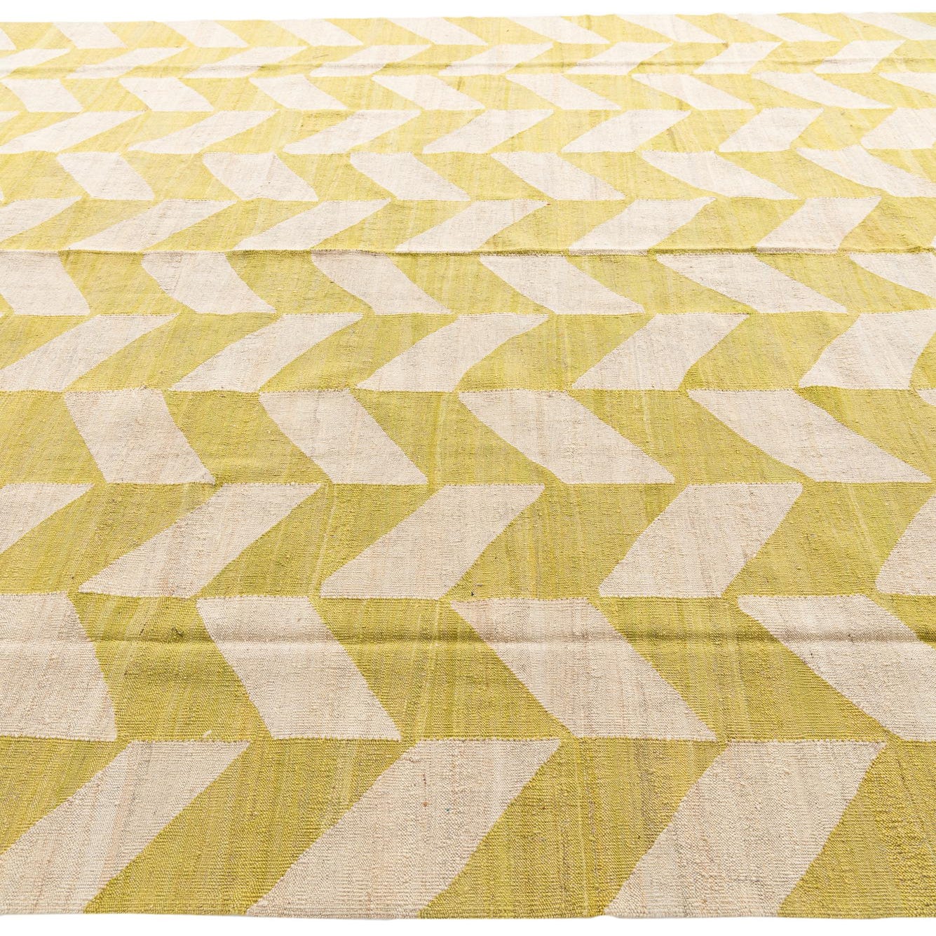 A 10x13 rectangular Kilim Modern rug with a bold ivory and lime green chevron pattern.