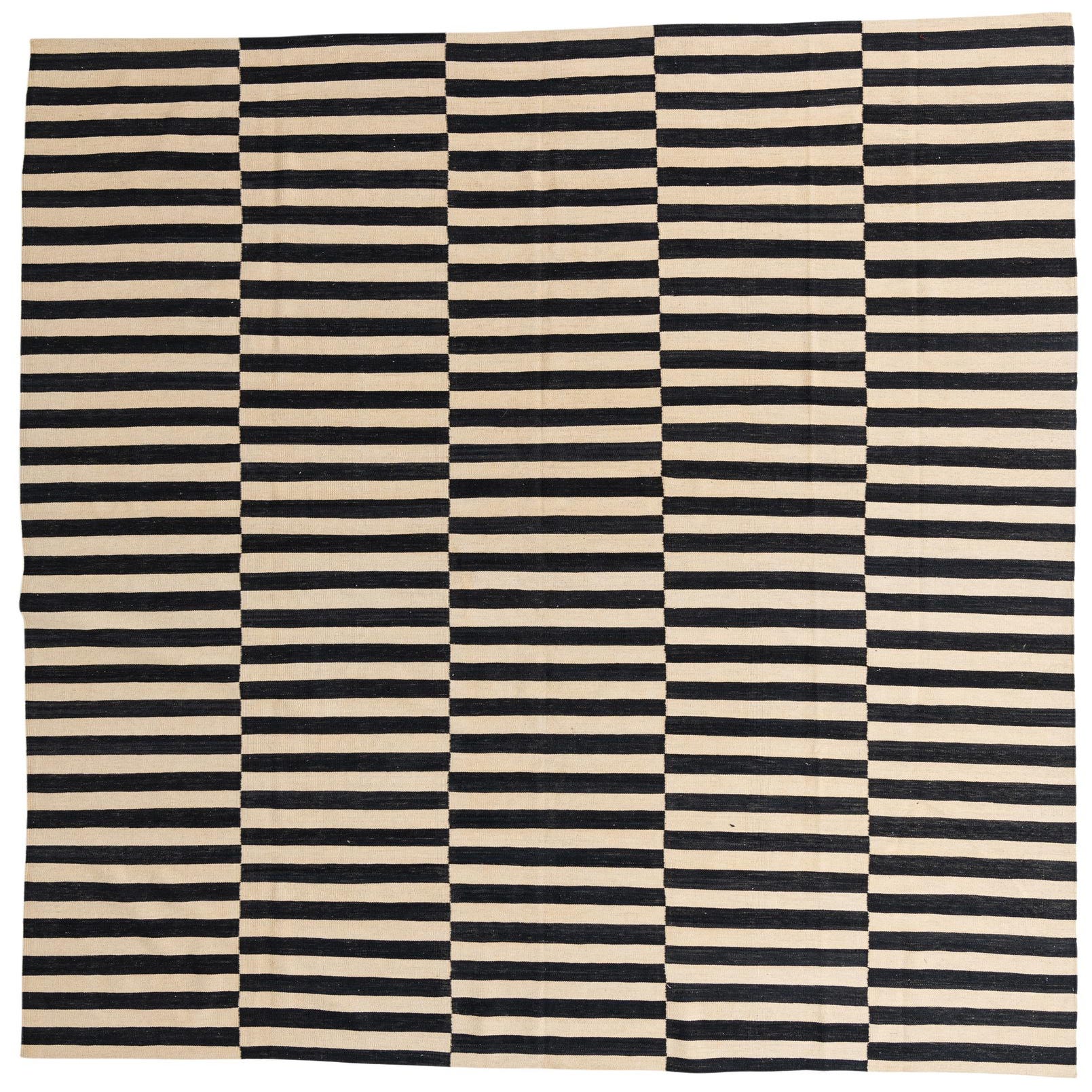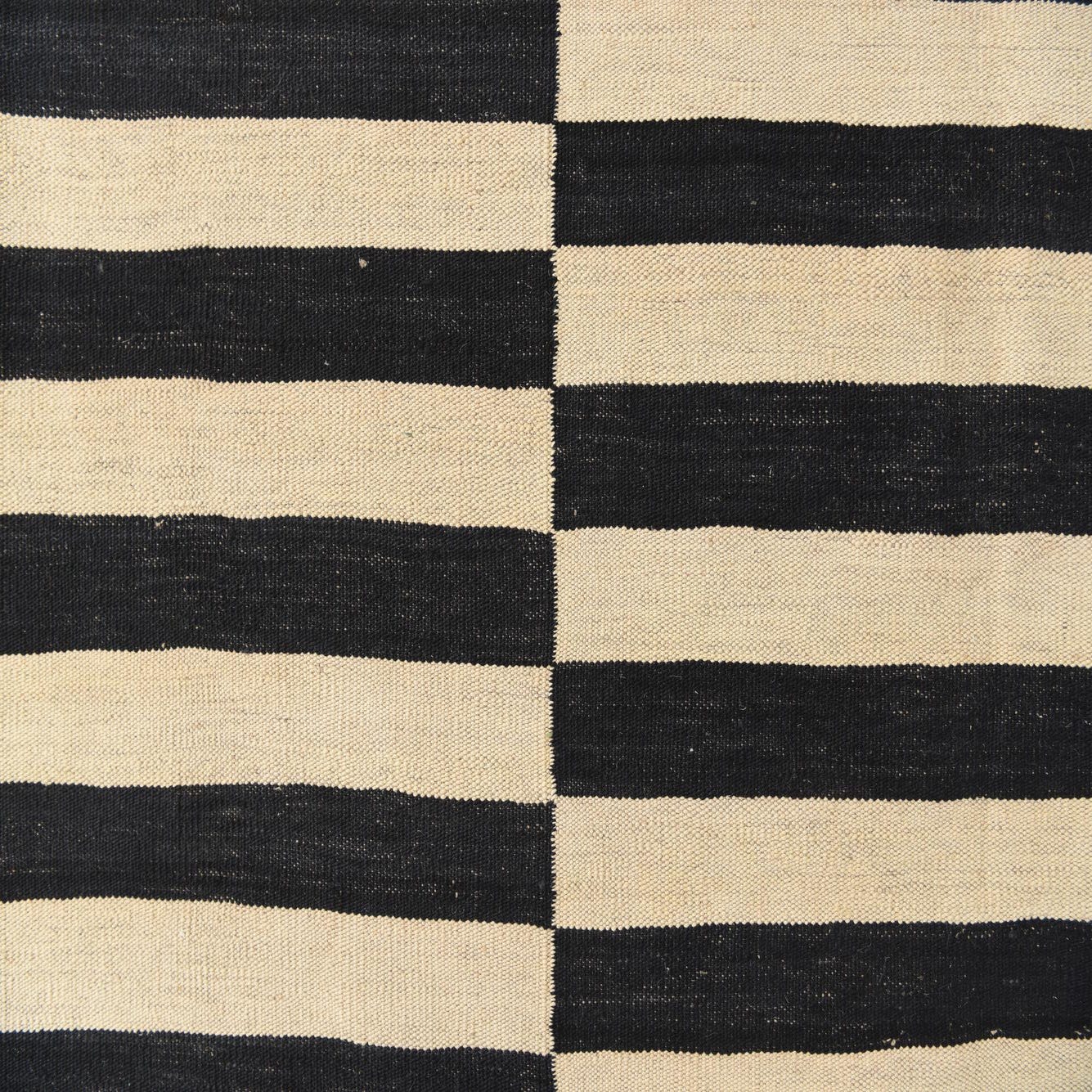 The Kilim Modern collection presents a hand-woven rug crafted from 100% wool in a generous 10x13 size, offering both comfort and durability. This piece exhibits a bold, linear pattern with alternating black and cream stripes that draw inspiration from traditional Kilim designs while embracing a contemporary aesthetic. The contrast between the stark black lines and the warm cream background makes this rug a striking statement piece.