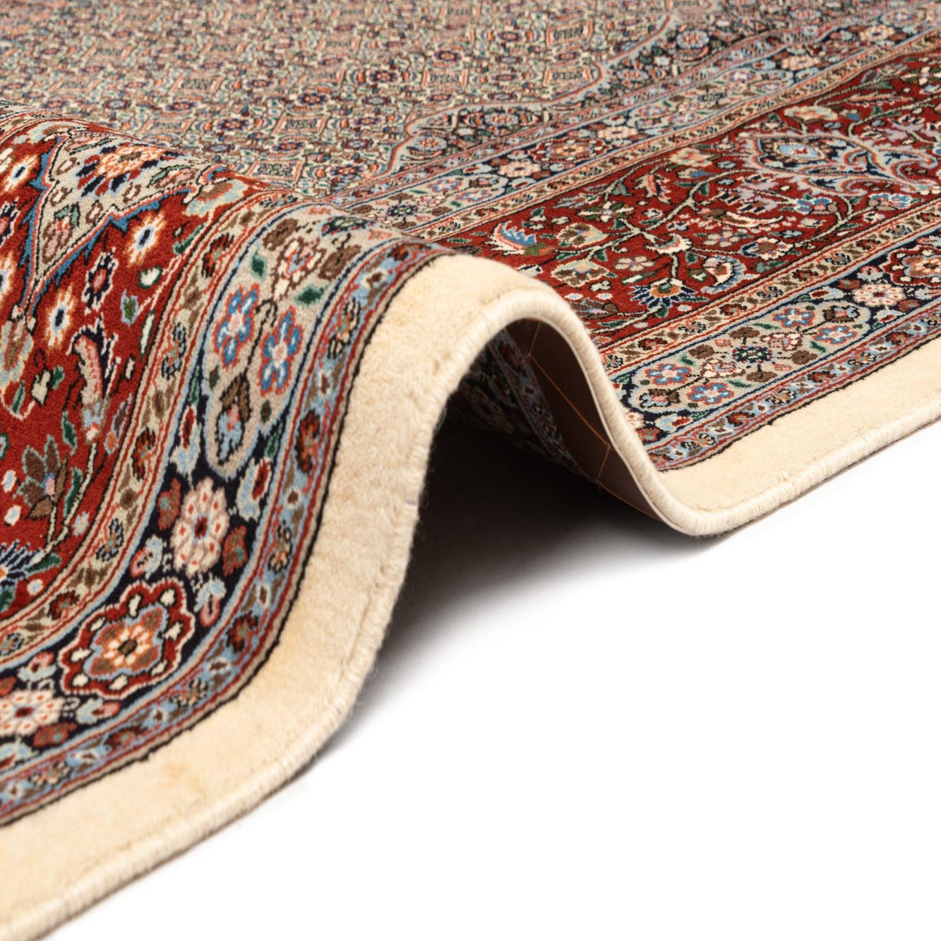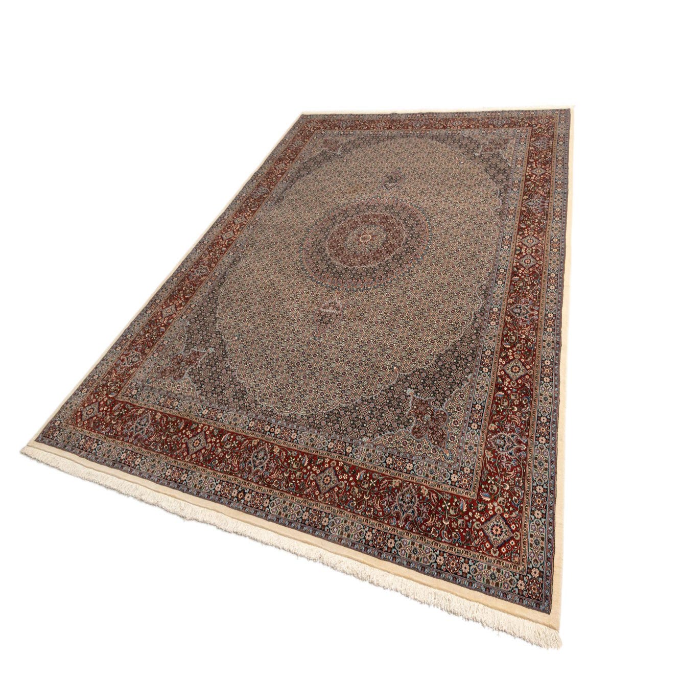 A large 10x13 rectangular Mood Persian rug in ivories and creams with a detailed central medallion and red border.