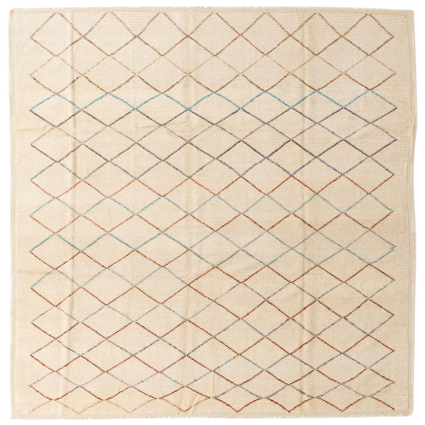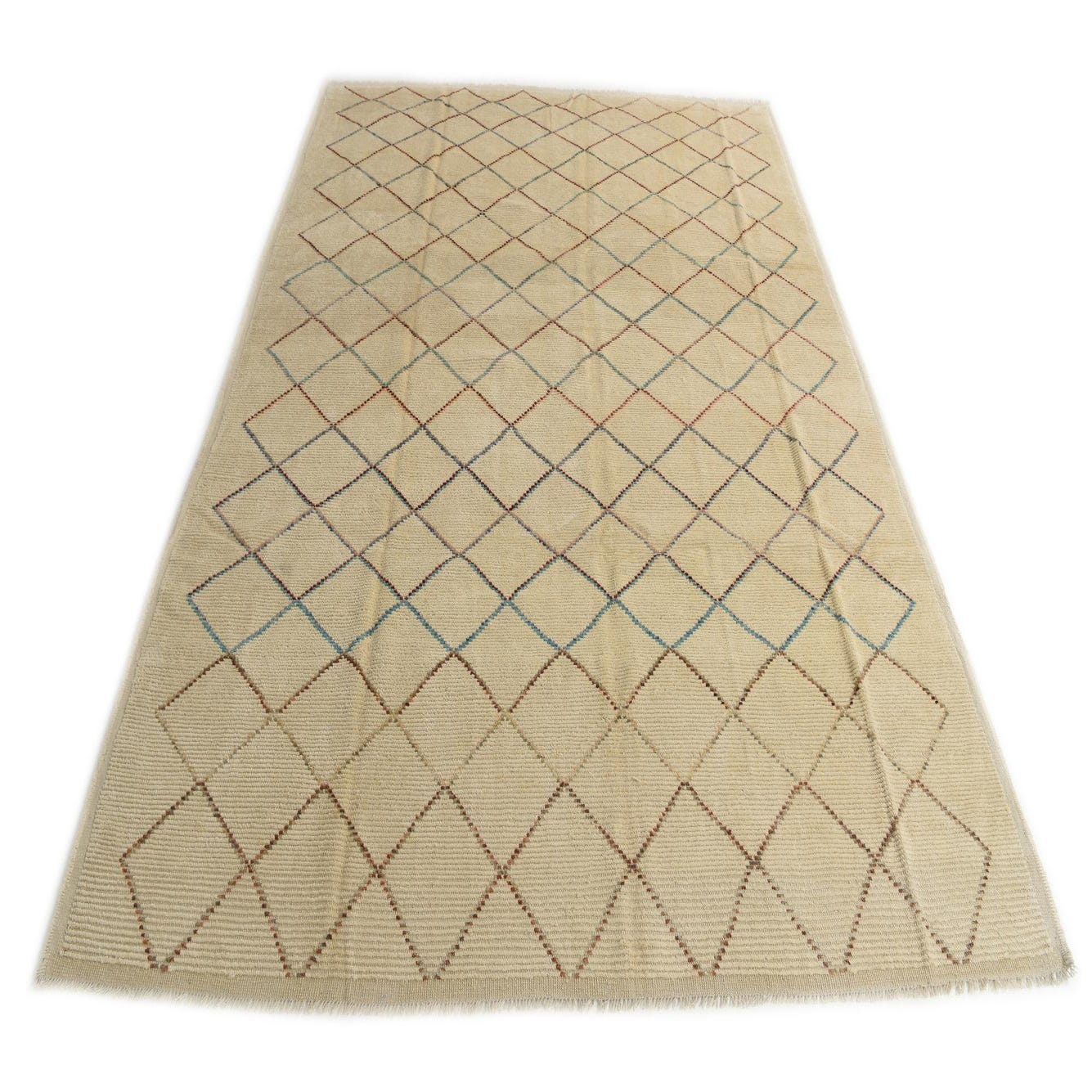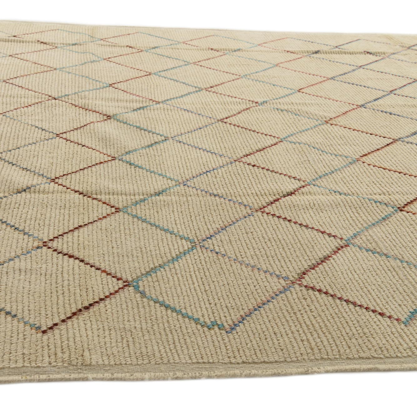 The Moroccan collection presents a sophisticated 10x13 hand-knotted rug, crafted from 100% wool for a soft and durable texture. The design features a cream background, lending a neutral foundation that is versatile and inviting. Atop this soothing base, a series of geometric diamond patterns unfolds in an array of pleasing colors, including burgundy, turquoise, and blue, which add a subtle yet impactful visual interest to the rug's overall aesthetic.