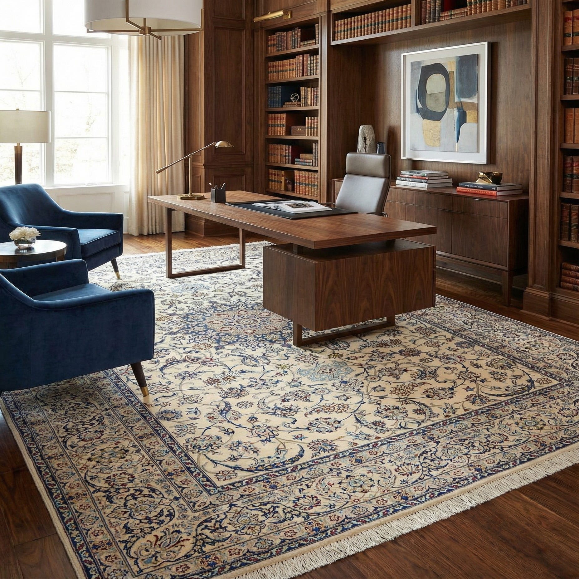 A 10x13 rectangular ivory Persian wool rug with a detailed floral medallion pattern and intricate border.
