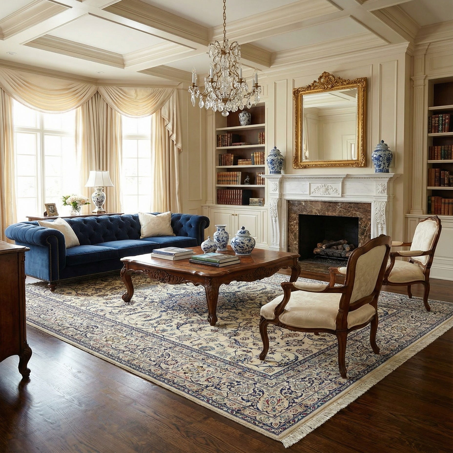 Crafted from wool, the texture of this rug is naturally resilient and offers a soft, inviting underfoot feel. Its sizable dimensions make it an ideal choice for spacious living areas, formal dining rooms, or large master bedrooms where it can serve as a sophisticated focal point. The traditional style, coupled with its elegant color scheme, allows this rug to be seamlessly incorporated into classic and transitional interiors. For an enduring aesthetic, pair it with refined wood furnishings, rich textiles, and a muted color palette to let the rug's artistry stand front and center.