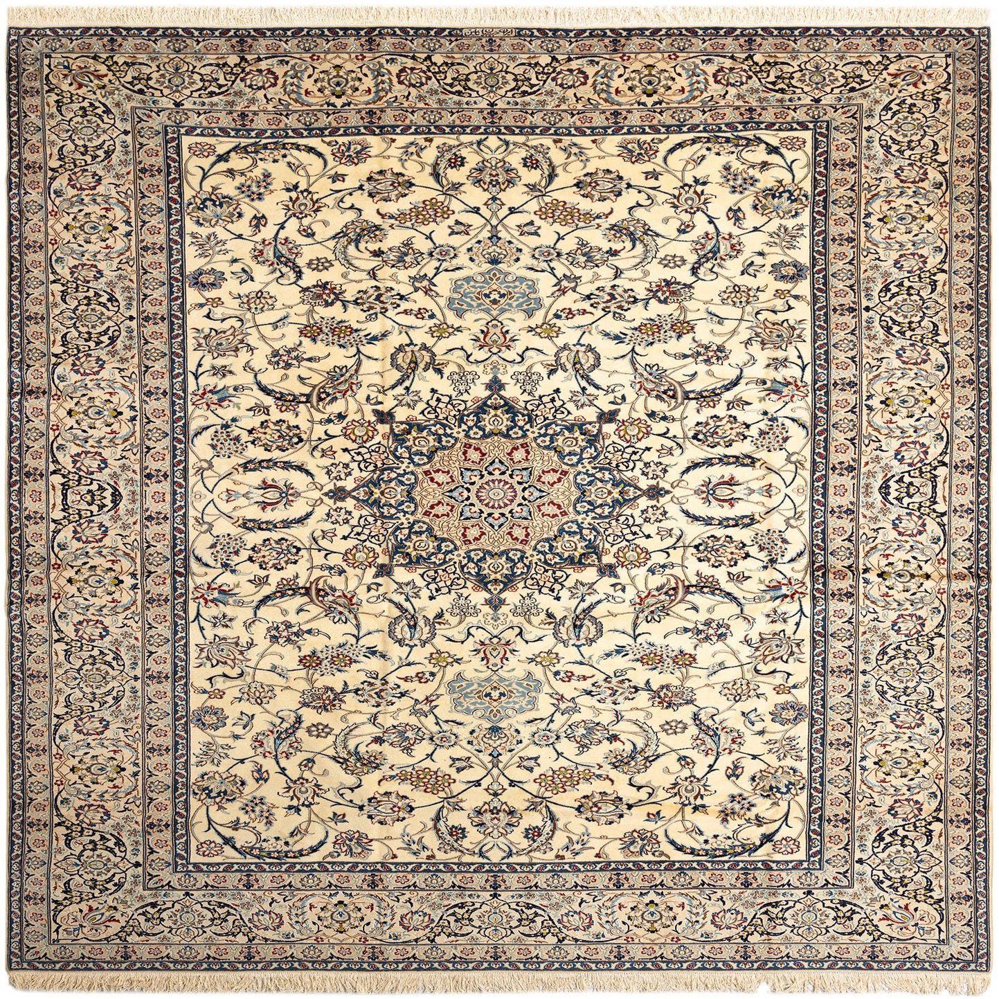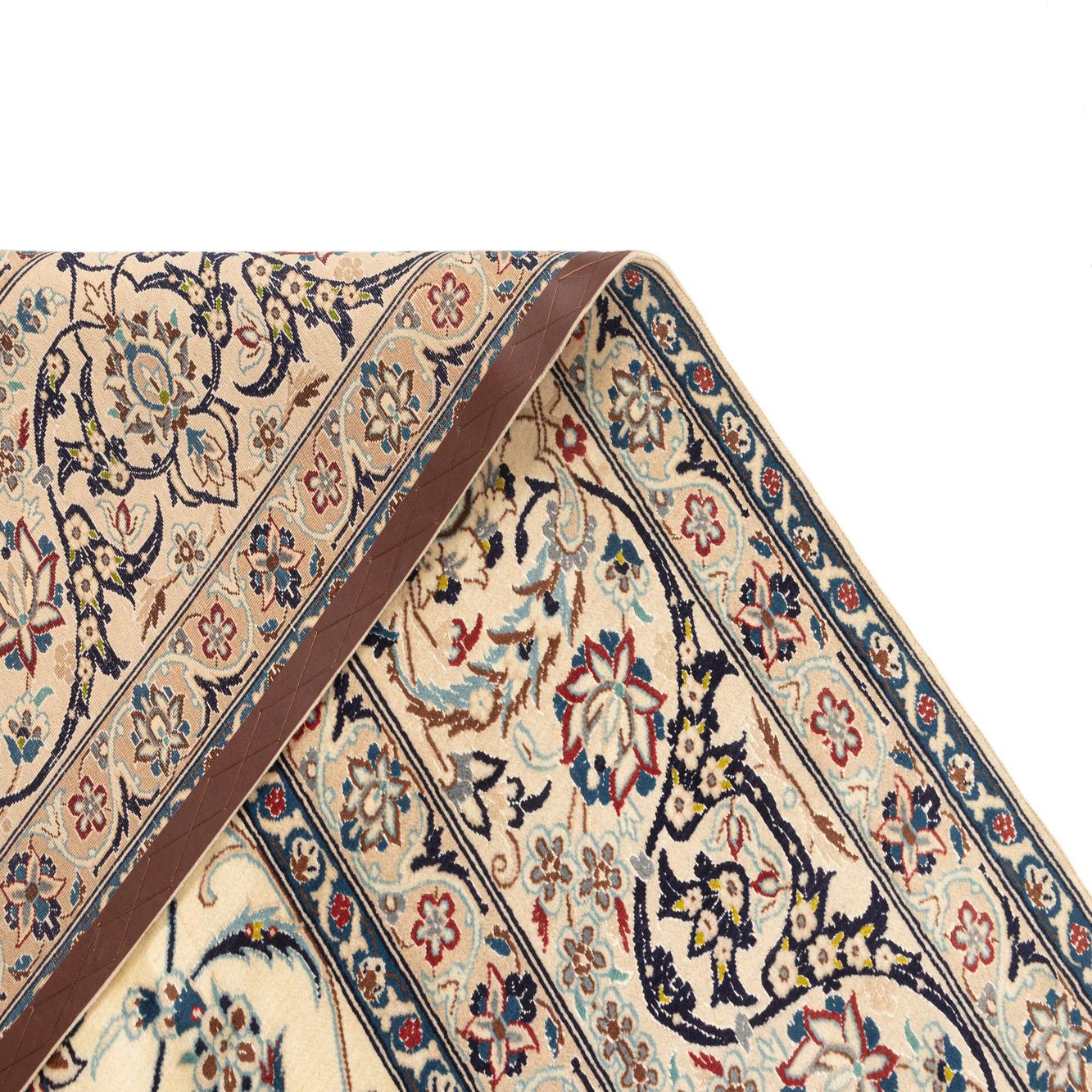 The Nain Collection offers this refined 10x13 hand-made wool rug that presents a cream background embellished with an intricate pattern. The design features a central medallion surrounded by ornate florals and accenting foliate motifs, executed in a harmonious palette that includes shades of navy, light blue, red, taupe, and hints of olive. The rug's border is equally detailed, providing a striking frame that echoes the colors and themes found throughout the field.