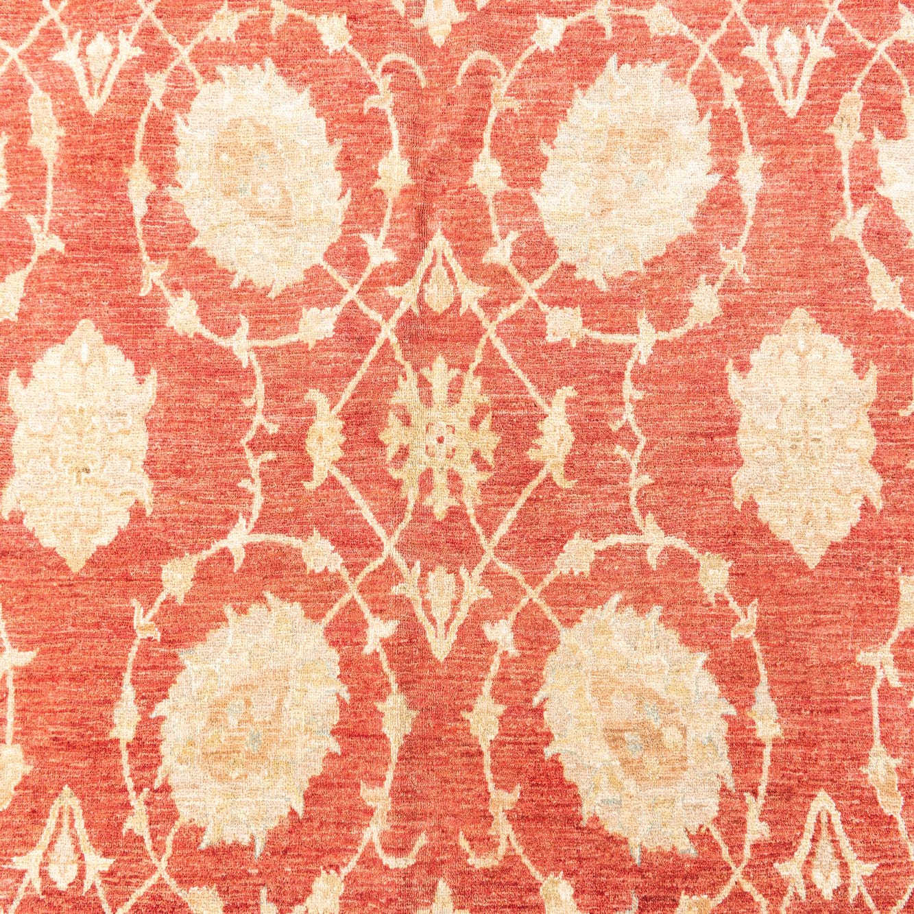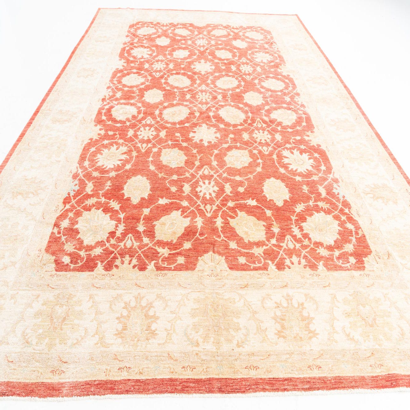 A 10x13 rectangular Peshawar Ziegler rug featuring a rich red field with intricate ivory and cream traditional floral patterns, framed by a wide ivory border with complementary motifs.