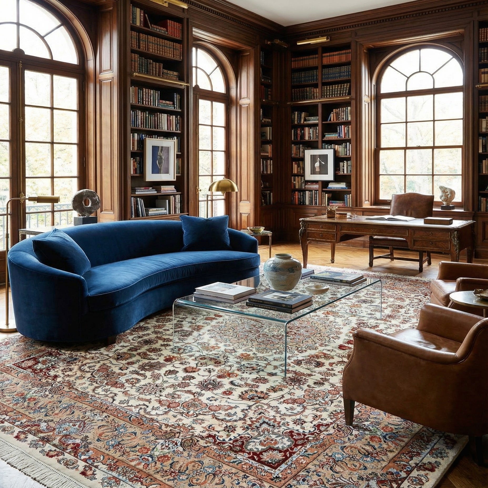 This rug works well as an anchor in a formal living room or beneath a dining table, and it brings a grounded, layered look to a seating area on hardwood or stone floors. It pairs naturally with warm wood furniture, neutral upholstery and classic or transitional interiors, and it can also provide a refined contrast to painted millwork or softer, modern furnishings.