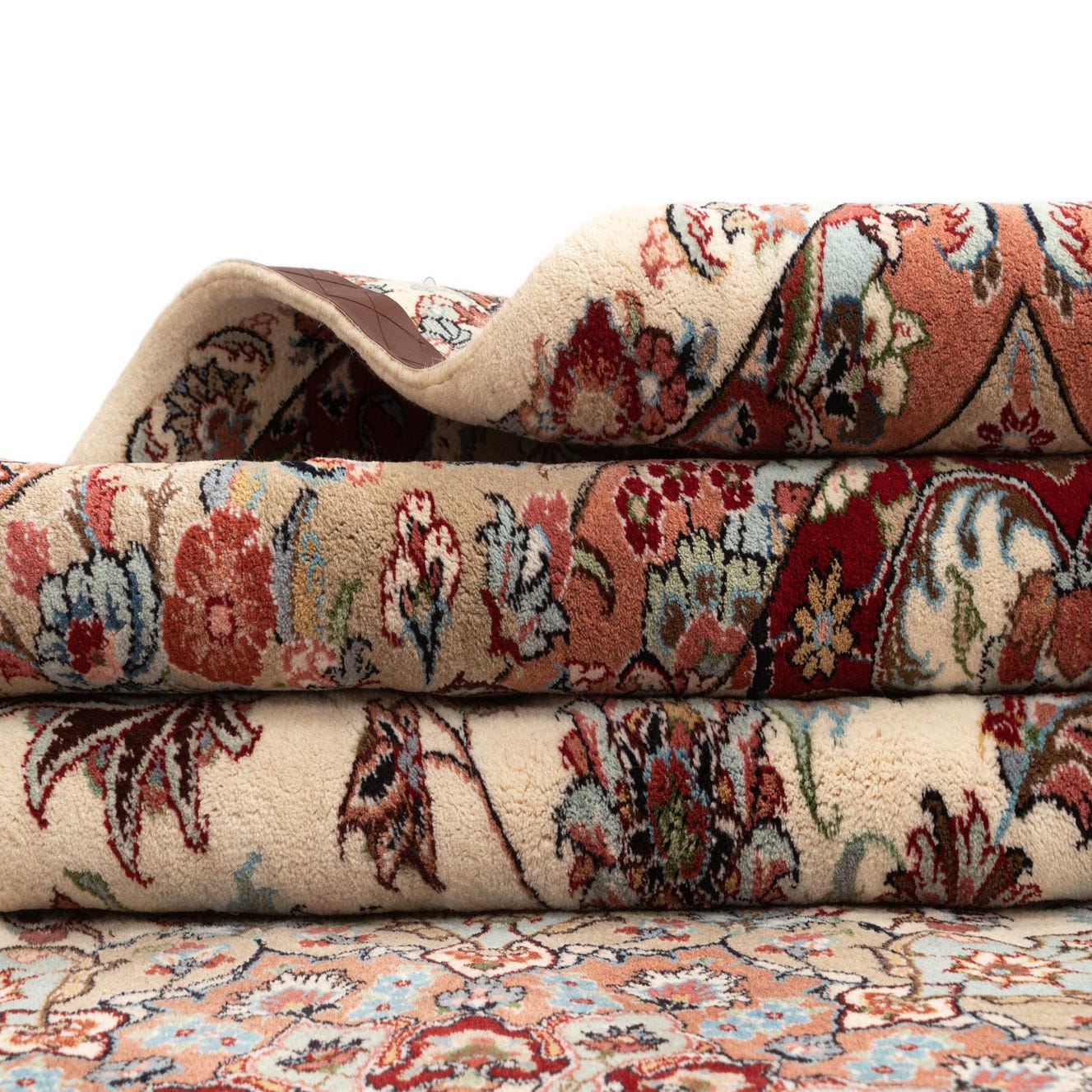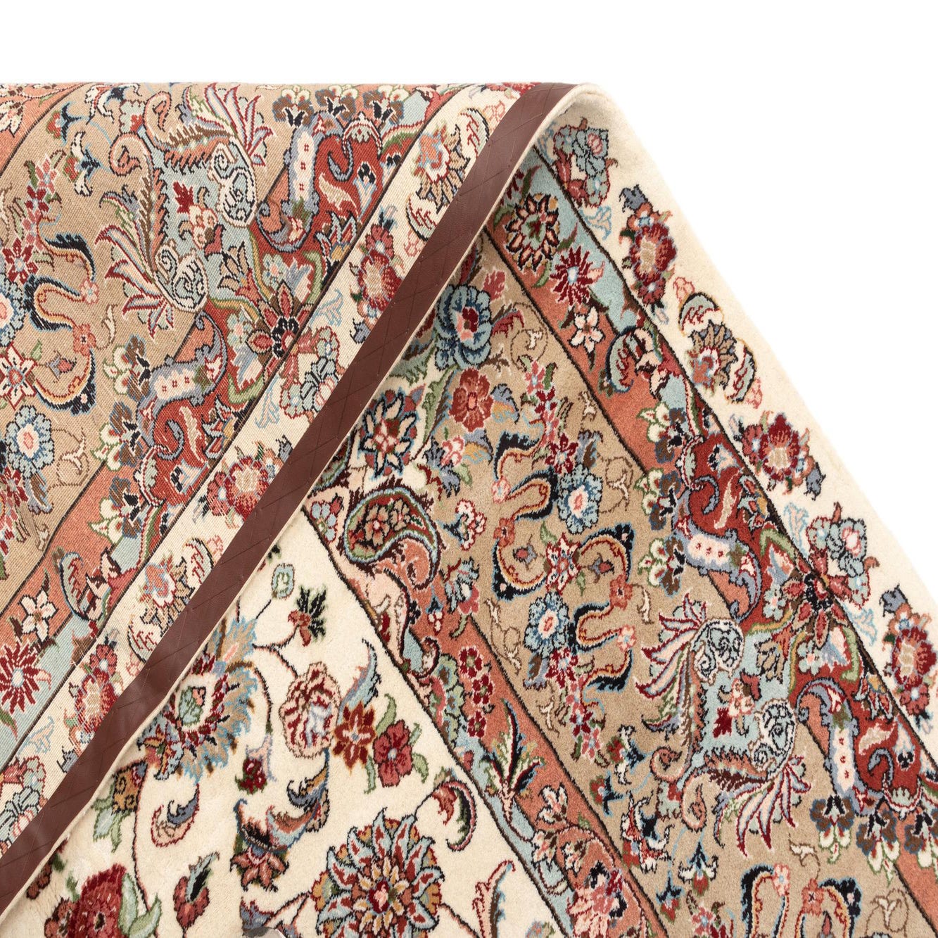 A traditional Persian-style rug with a central medallion and an all-over floral vine field set against a cream background. The design pairs a warm beige border with rust and deep red accents, soft blue highlights and subtle gold and brown tones woven into palmettes, rosettes and scrolling tendrils. Hand-made of wool, the pile feels soft and substantial underfoot with a fine knotting that gives the motifs crisp definition and gentle, natural variation from hand craftsmanship; short fringe trims the ends for a finished look.