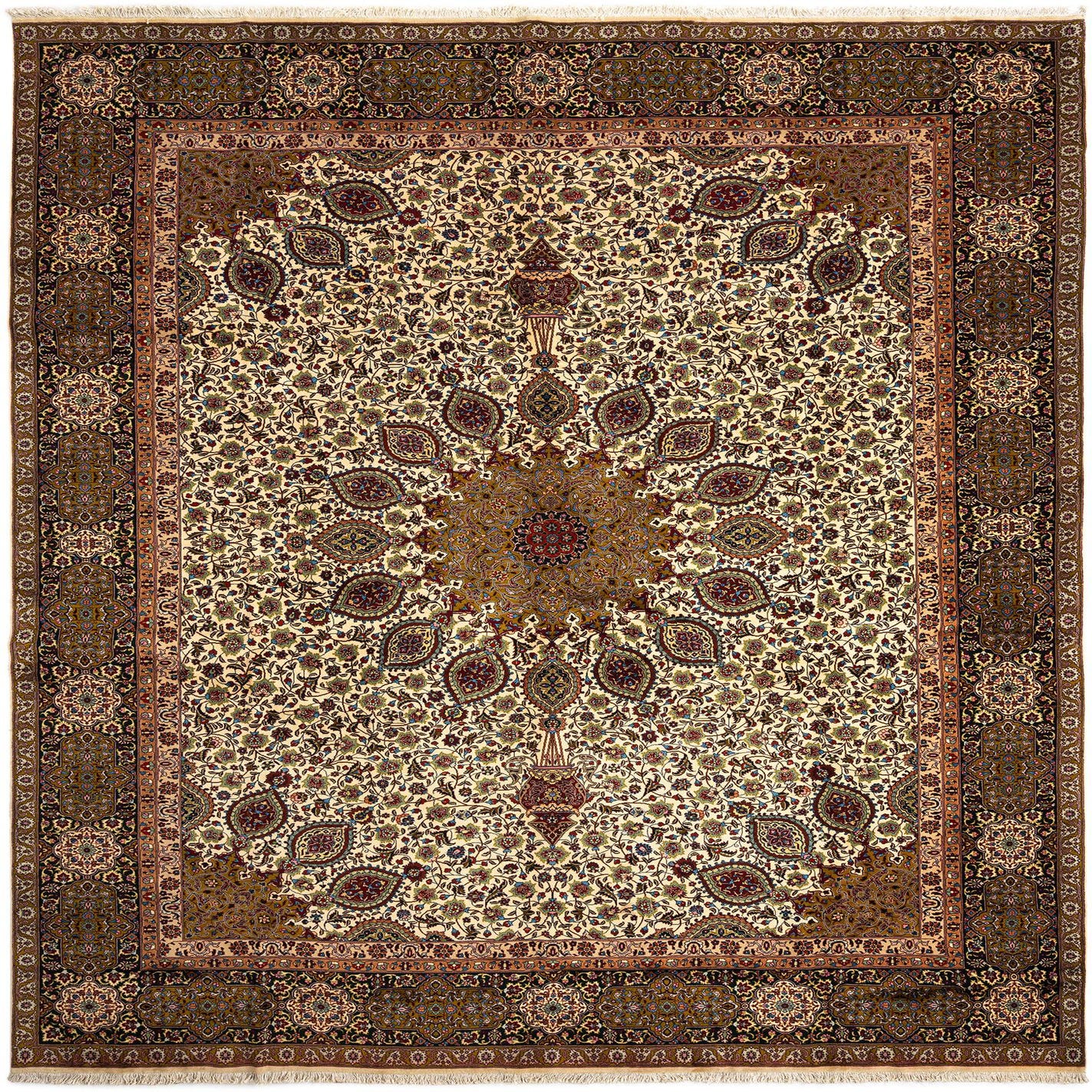 A large 10x13 rectangular ivory Persian wool rug with an intricate floral medallion pattern and a detailed brown border.